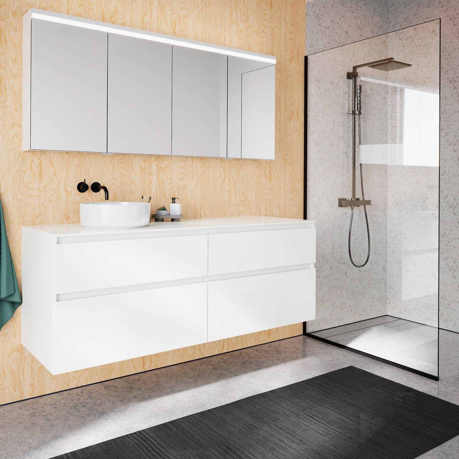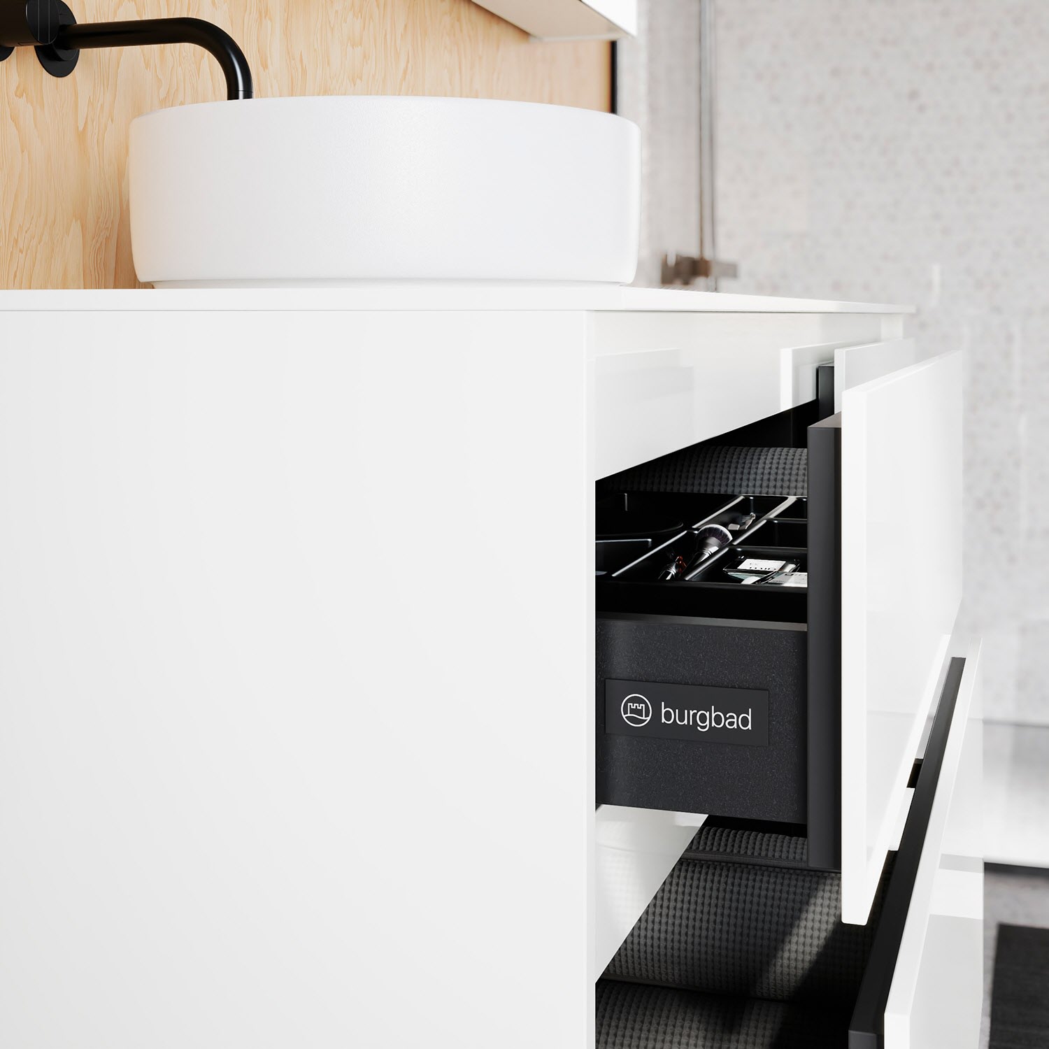 burgbad Lin20 Waschtischunterschrank mit Konsolenplatte 160 cm, 4 Auszüge, Beckenausschnitt links