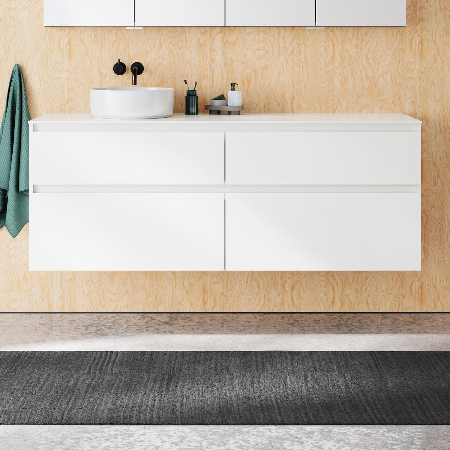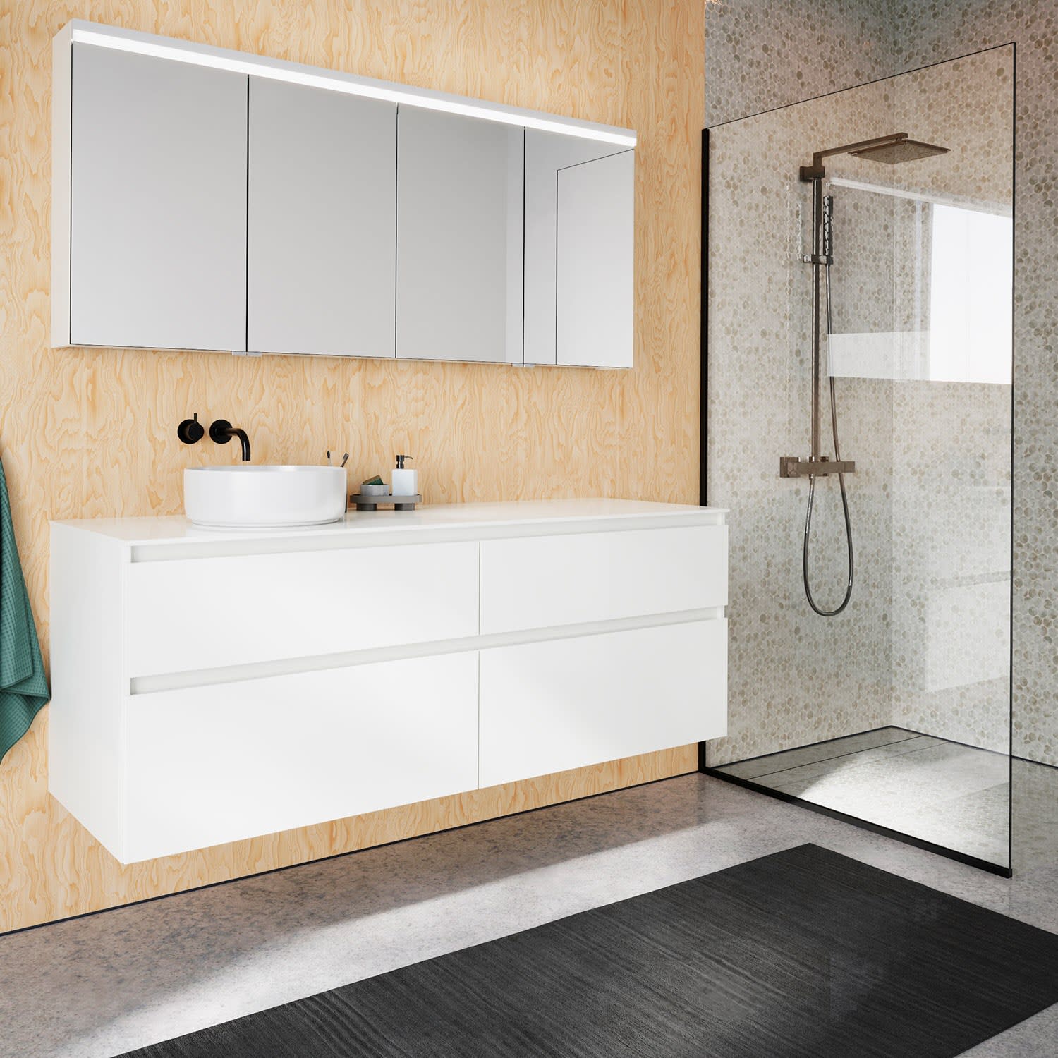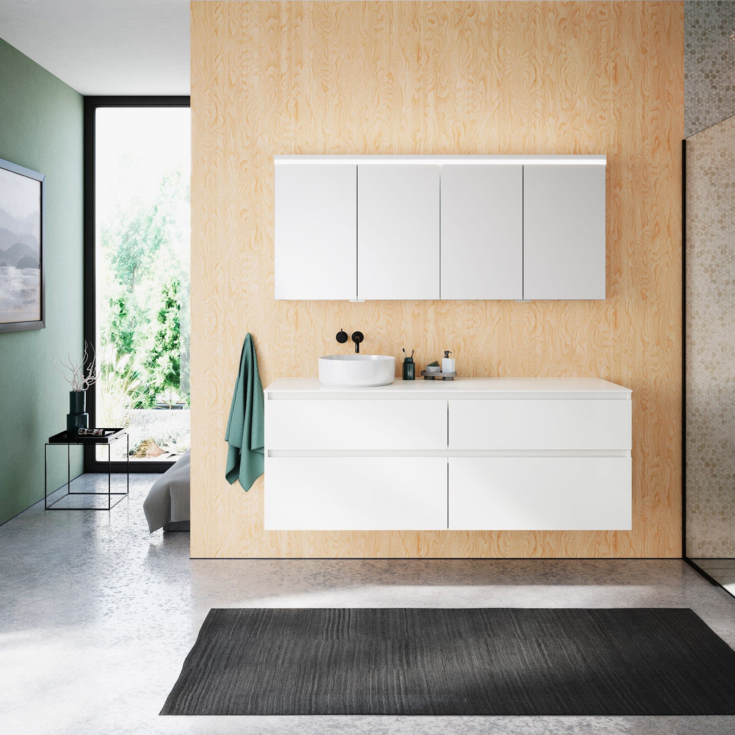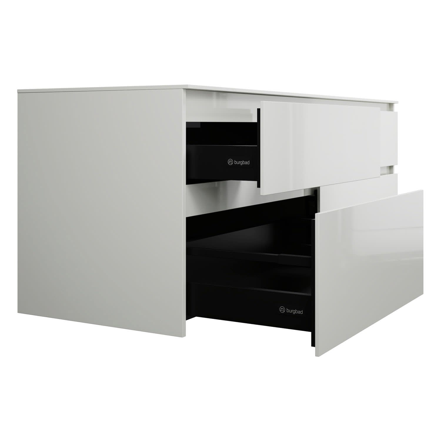 burgbad Lin20 Waschtischunterschrank mit Konsolenplatte 160 cm, 4 Auszüge, Beckenausschnitt links