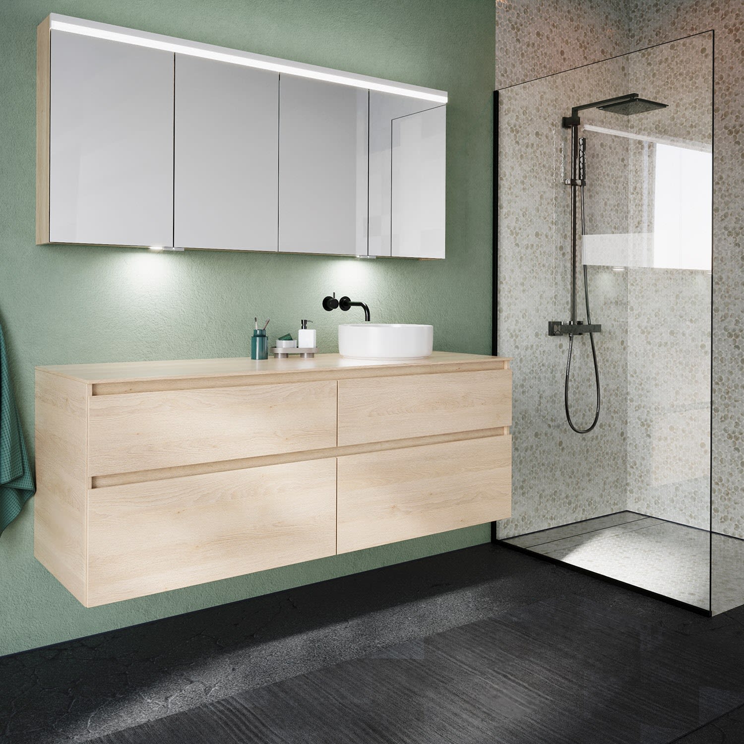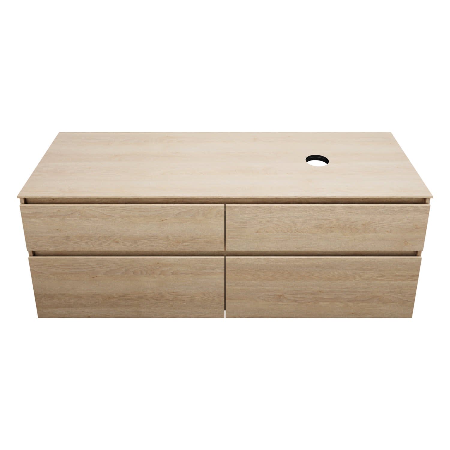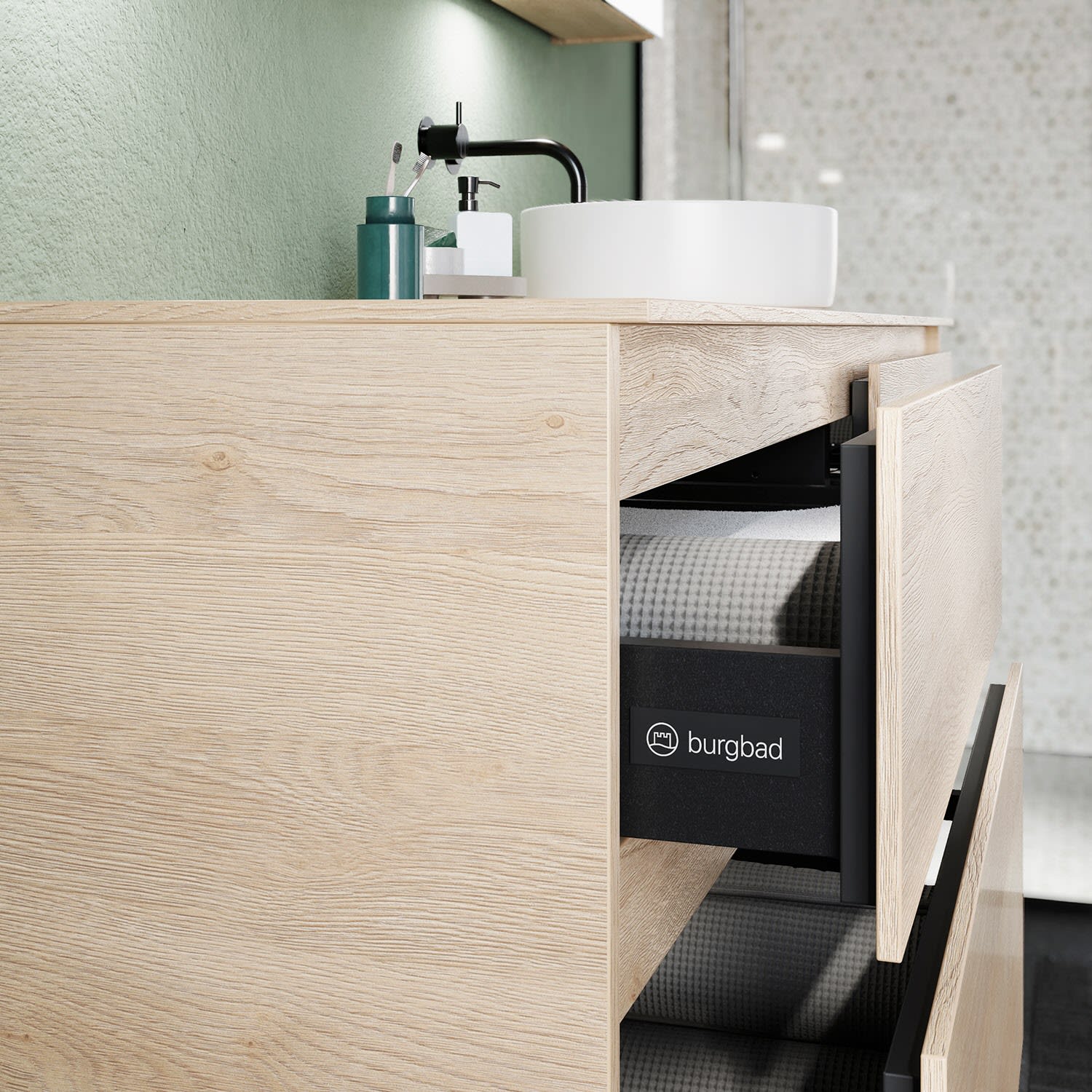 burgbad Lin20 Waschtischunterschrank mit Konsolenplatte 160 cm, 4 Auszüge, Beckenausschnitt rechts