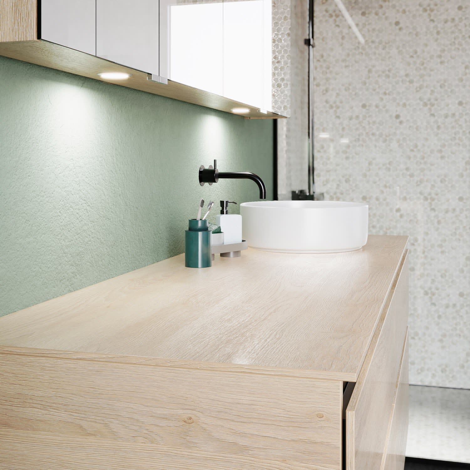 Die Waschtischplatte wird ohne Armaturbohrung geliefert. Armaturbohrungen müssen bauseits vorgenommen werden.
