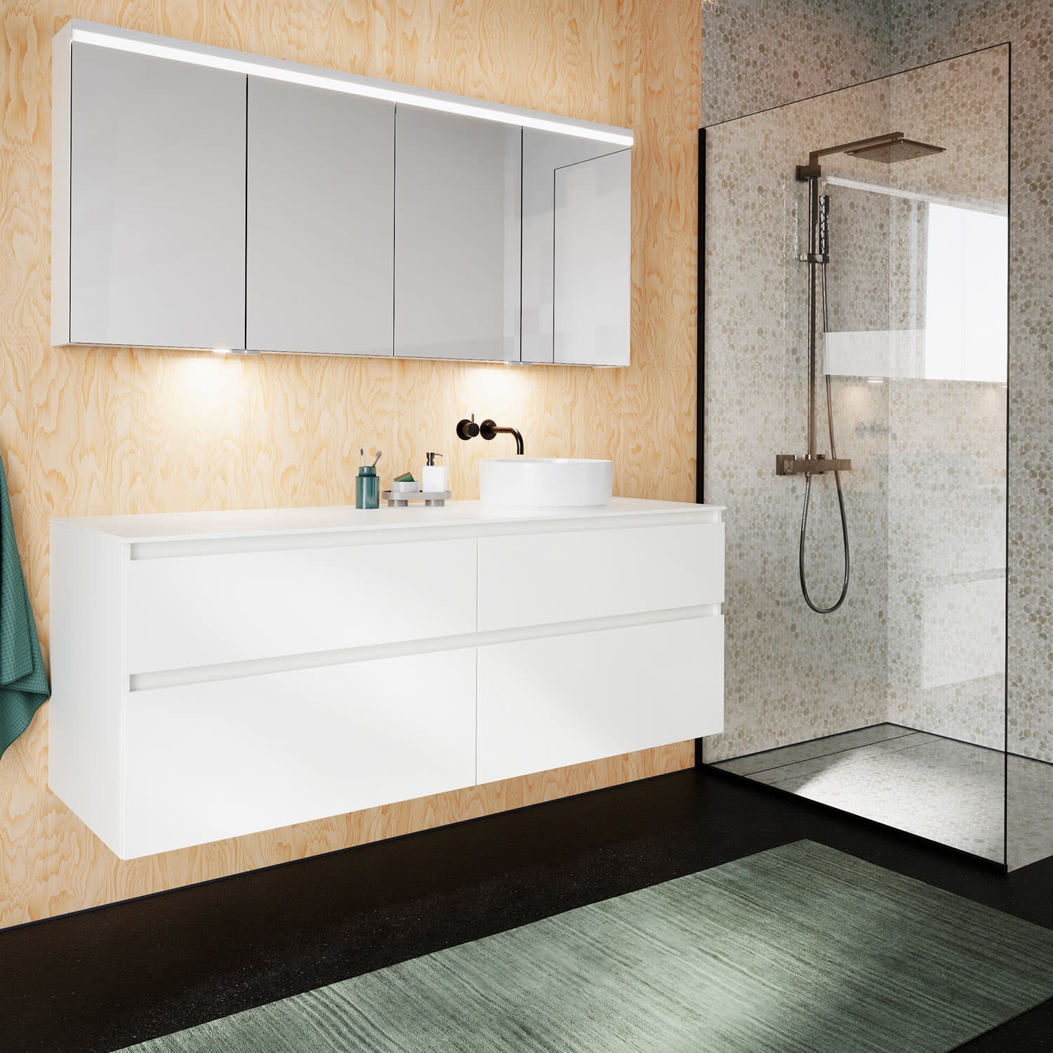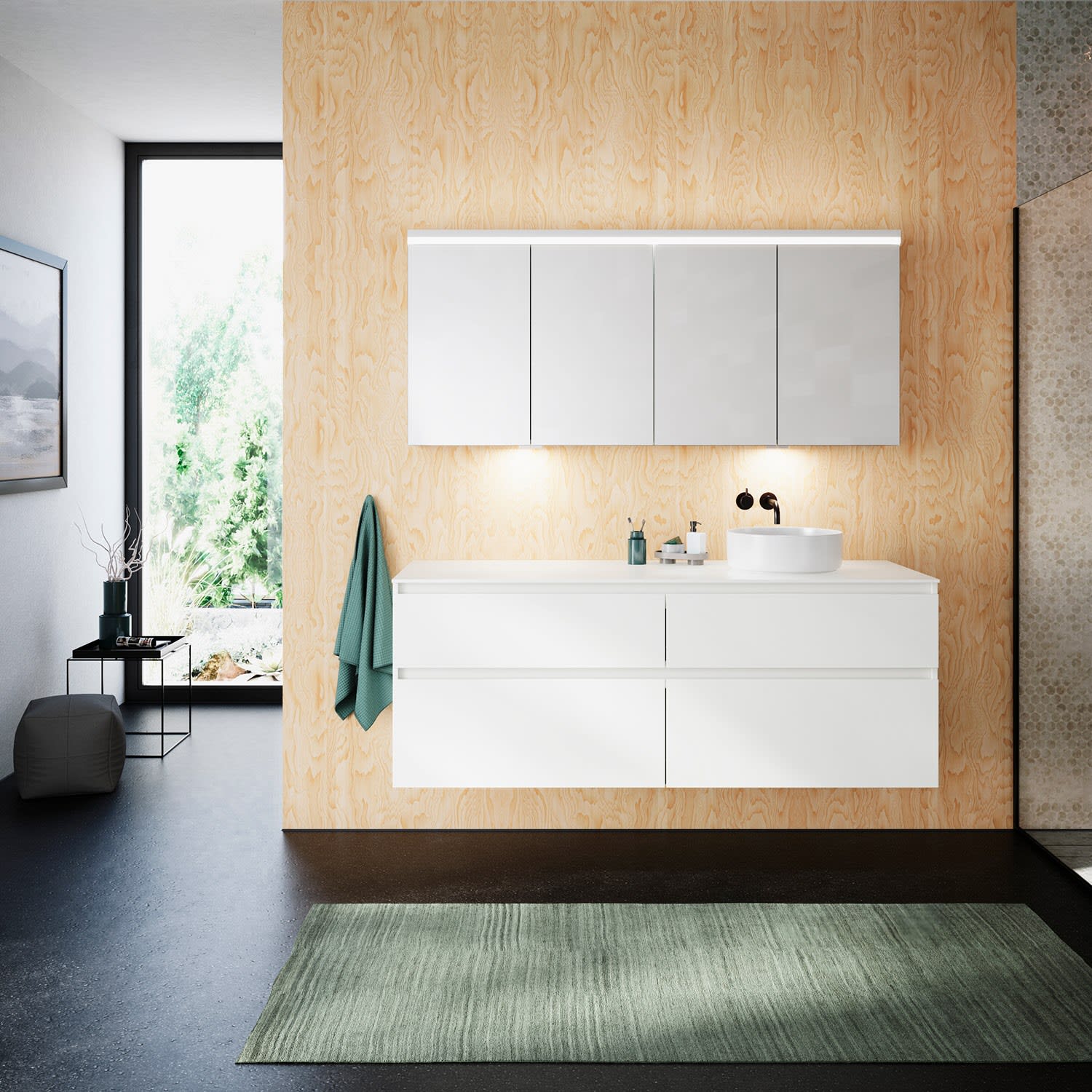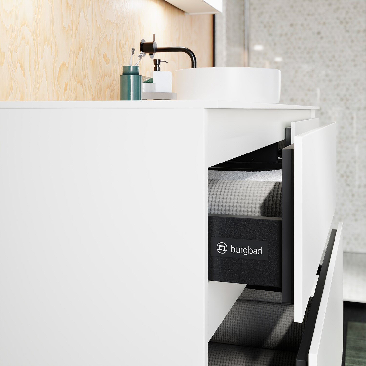 burgbad Lin20 Waschtischunterschrank mit Konsolenplatte 160 cm, 4 Auszüge, Beckenausschnitt rechts