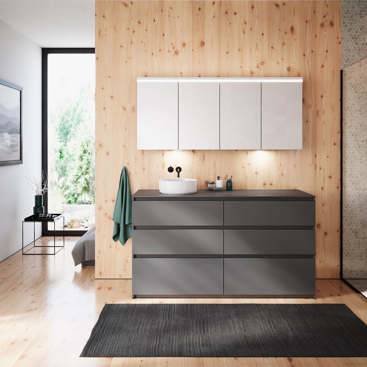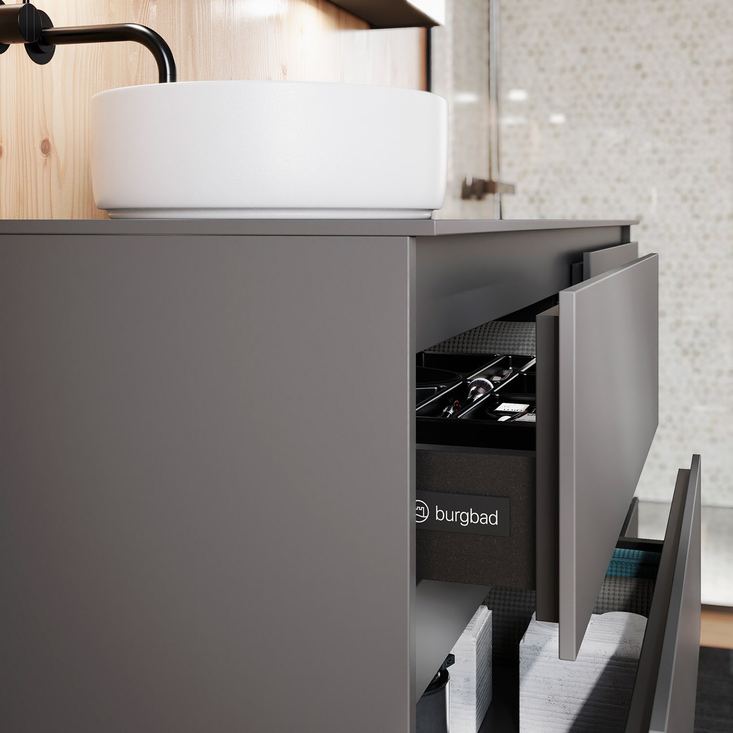 burgbad Lin20 Waschtischunterschrank mit Konsolenplatte 160 cm, 6 Auszüge, Beckenausschnitt links