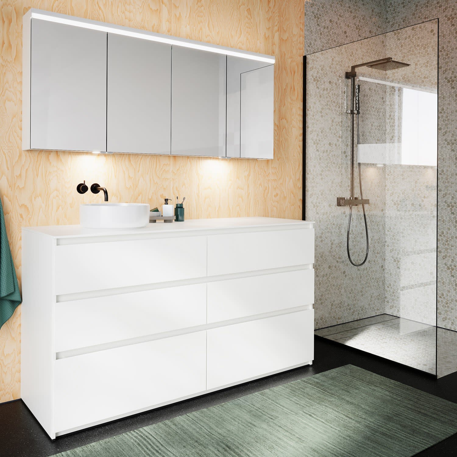 burgbad Lin20 Waschtischunterschrank mit Konsolenplatte 160 cm, 6 Auszüge, Beckenausschnitt links