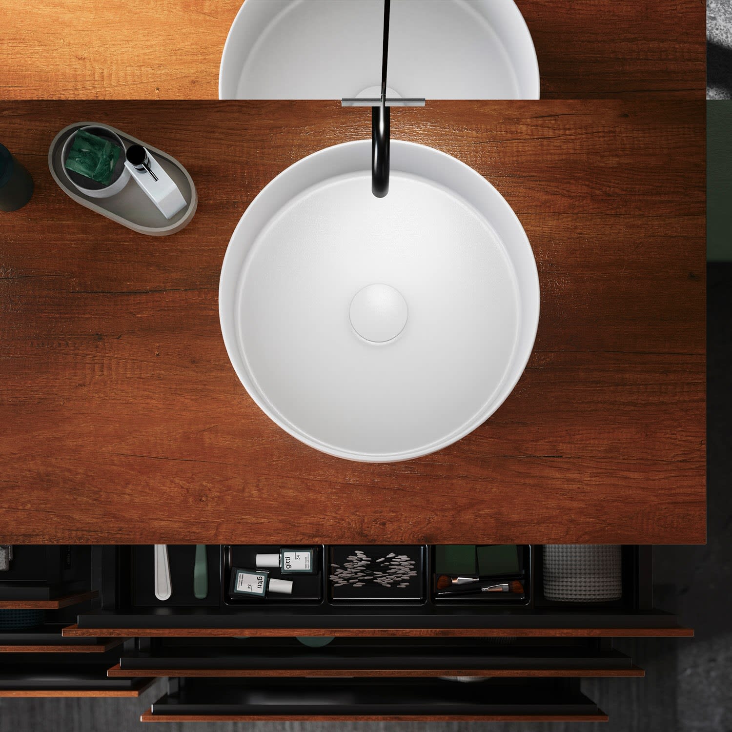 - 2 Auszüge oben H: 22 T: 35 cm, 1x mit Siphonausschnitt und Inneneinteilung