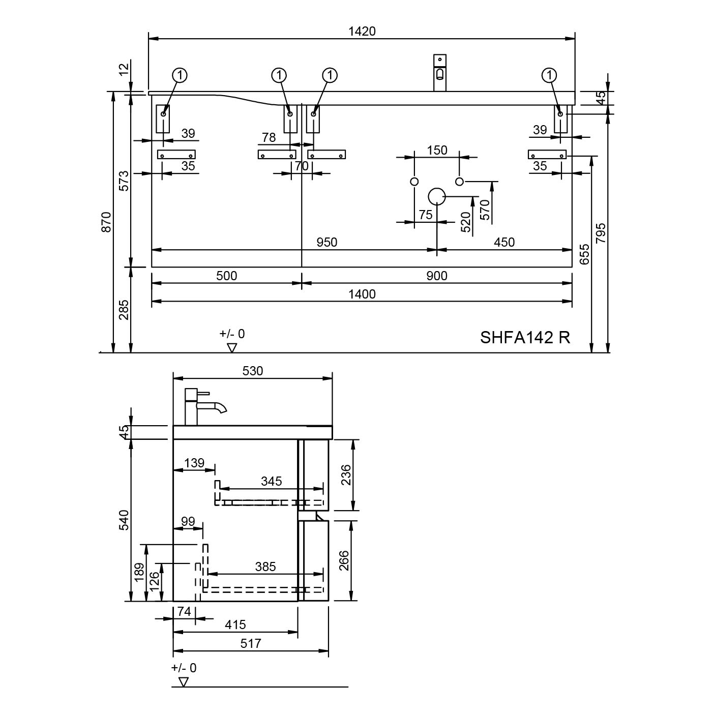 - 1 Schublade oben, mit Siphonausschnitt und Inneneinteilung