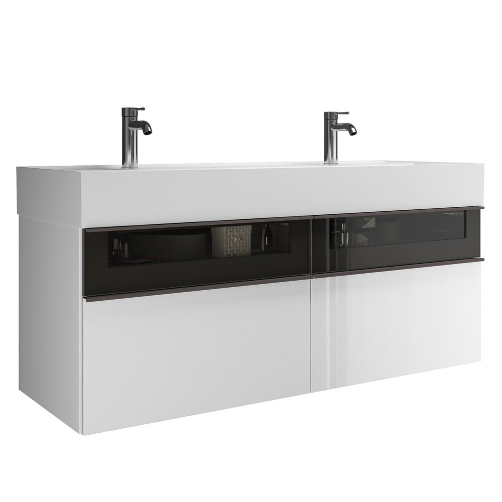 burgbad Yumo Mineralguss-Doppelwaschtisch OHNE Hahnlochbohrung, inkl. Waschtischunterschrank 131,5 cm mit obere Alurahmenfront