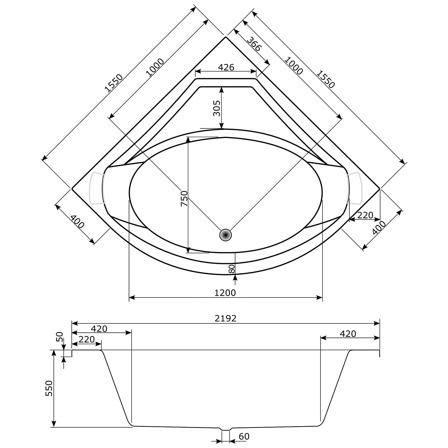 L: 155 B: 155 H: 54,5 cm