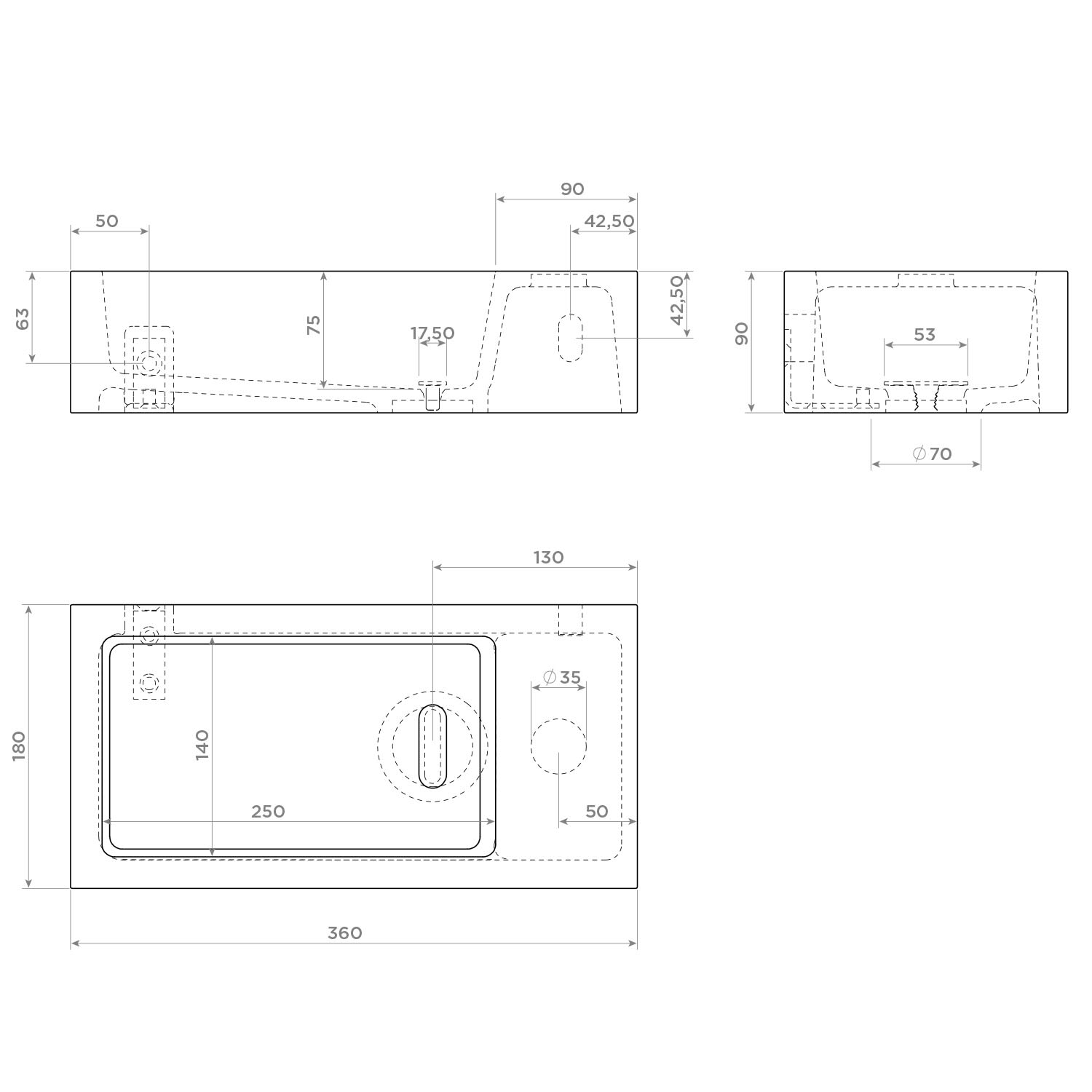 Clou Flush 3 Right Aluite-Handwaschbecken 36 x 18 cm mit vorgestochenem Hahnloch rechts