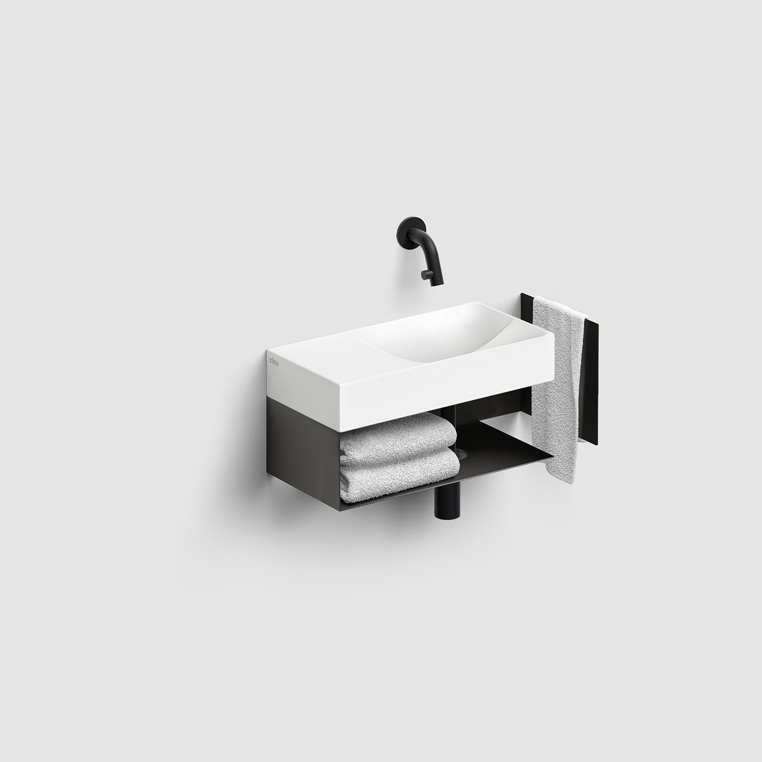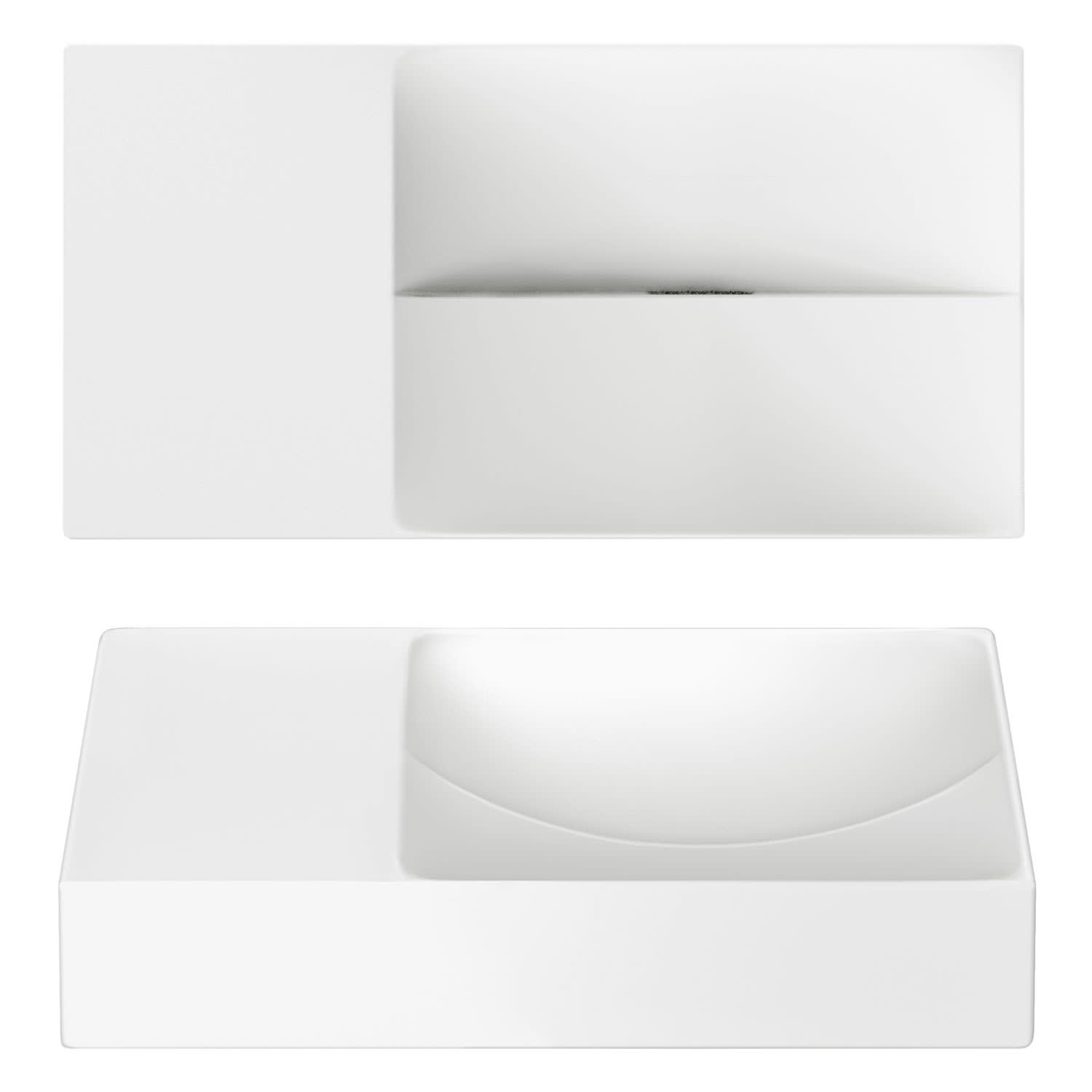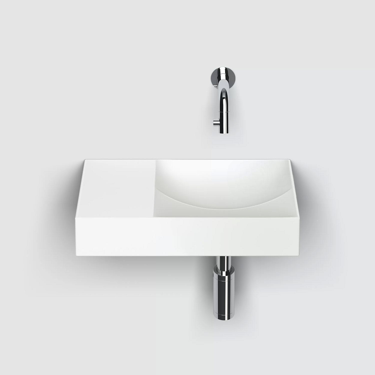 Zwei Ebenen, zwei Kurven mit unterschiedlichen Höhen. Ein einfallsreiches Design sorgt dafür, dass Wasser ordentlich abfließt. Keine Ablaufgarnitur erforderlich. An die Ablaufplatte am Boden des Handwaschbeckens kann jeder handelsübliche Siphon montiert werden.
