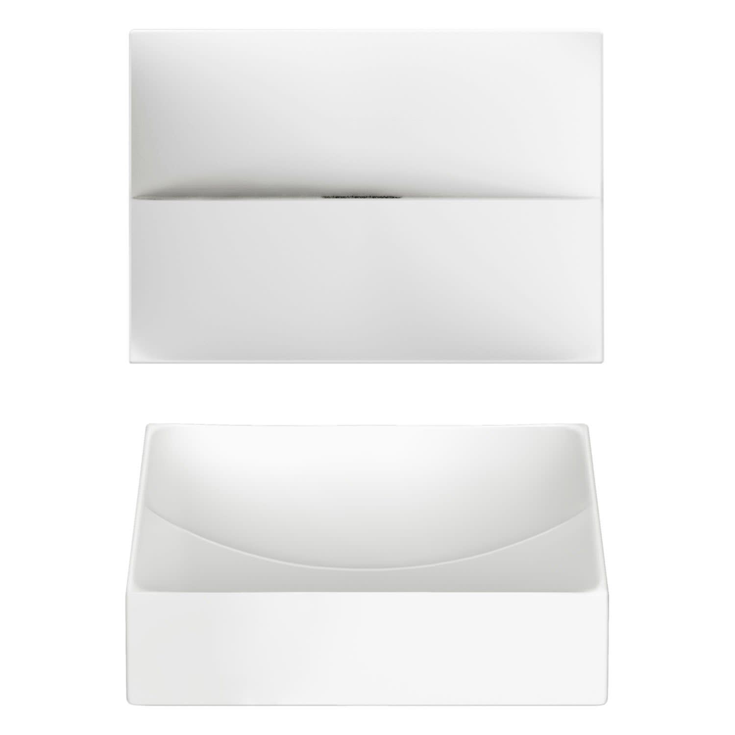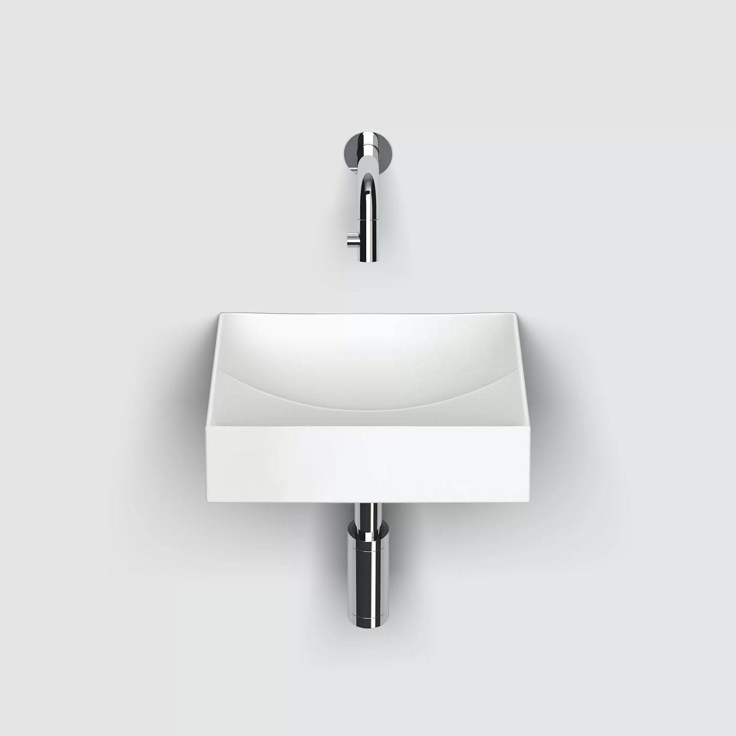 Zwei Ebenen, zwei Kurven mit unterschiedlichen Höhen. Ein einfallsreiches Design sorgt dafür, dass Wasser ordentlich abfließt. Keine Ablaufgarnitur erforderlich. An die Ablaufplatte am Boden des Handwaschbeckens kann jeder handelsübliche Siphon montiert werden.