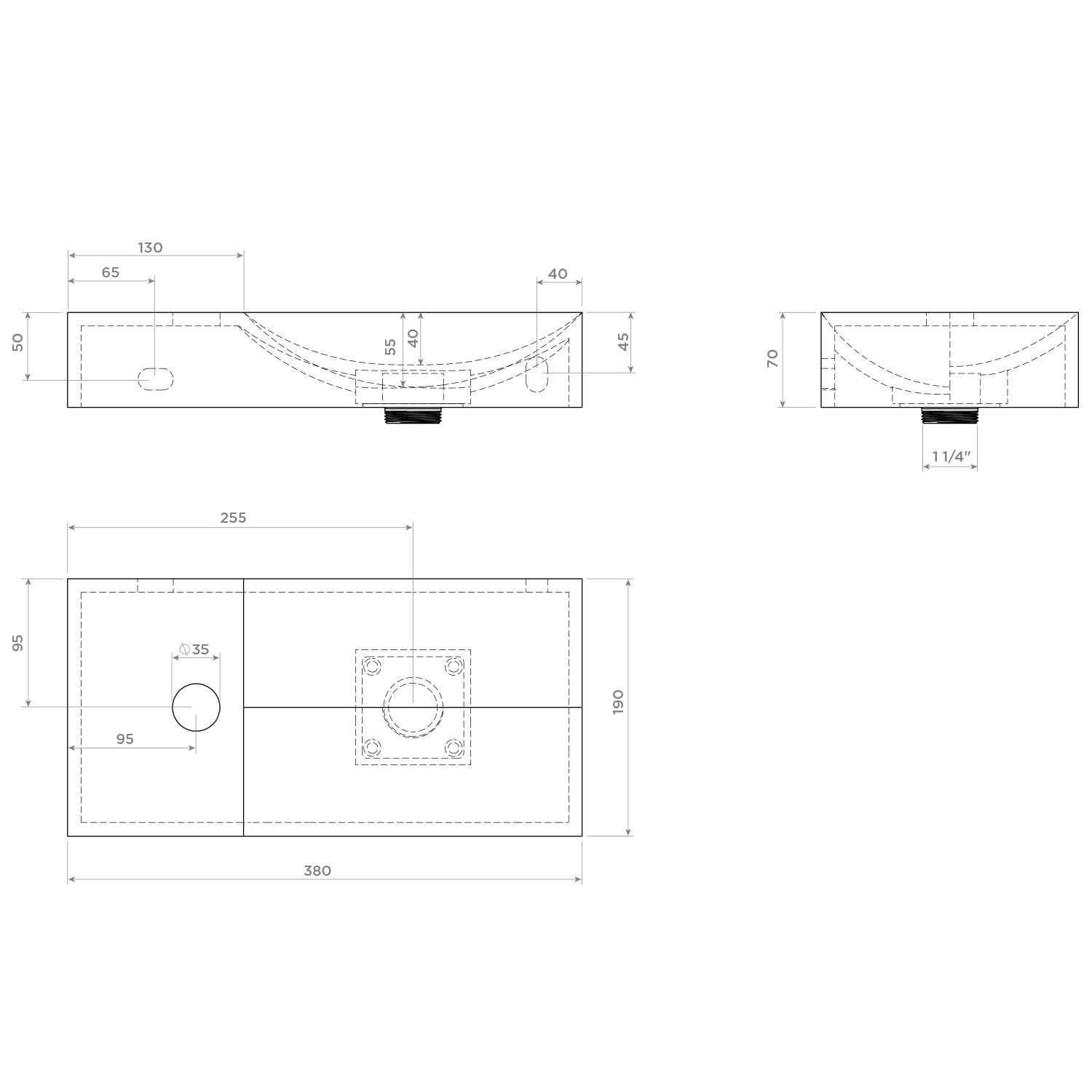 Zwei Ebenen, zwei Kurven mit unterschiedlichen Höhen. Ein einfallsreiches Design sorgt dafür, dass Wasser ordentlich abfließt. Keine Ablaufgarnitur erforderlich. An die Ablaufplatte am Boden des Handwaschbeckens kann jeder handelsübliche Siphon montiert werden.