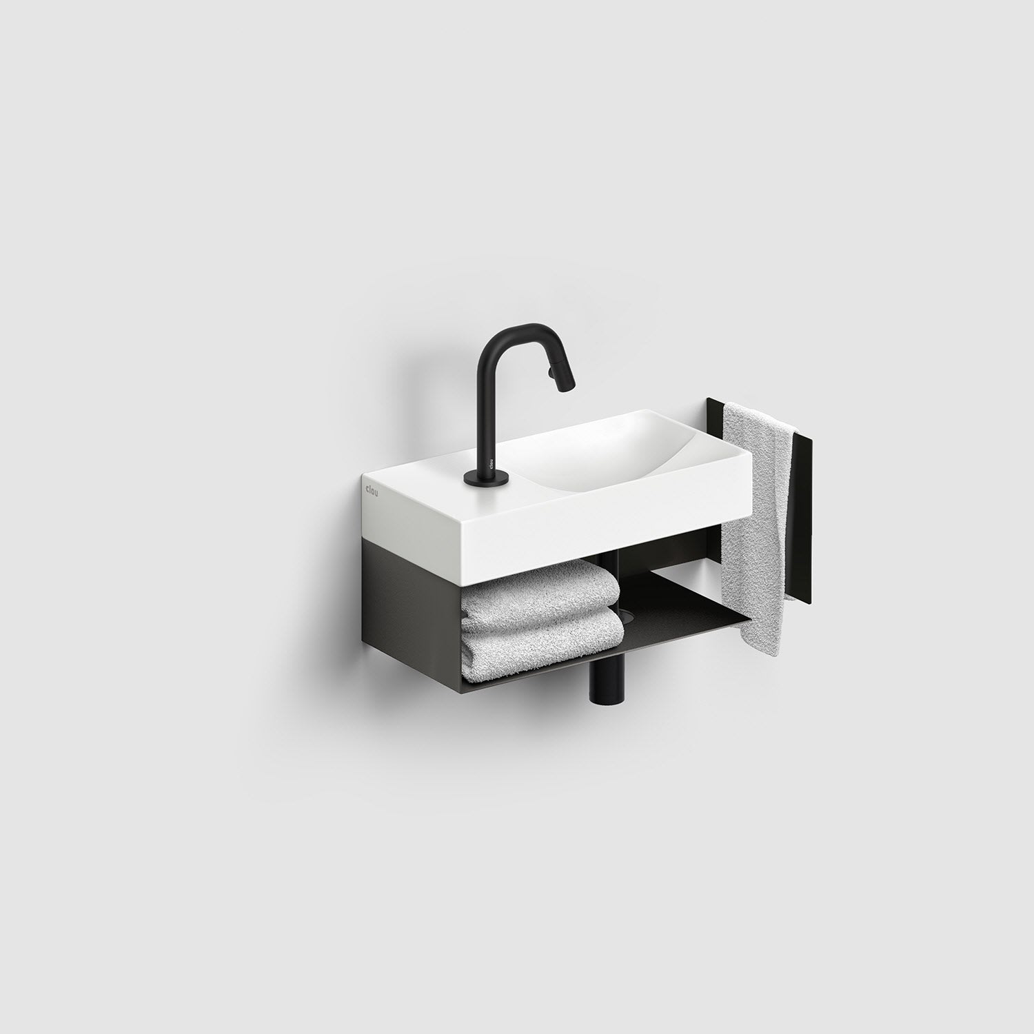 Zwei Ebenen, zwei Kurven mit unterschiedlichen Höhen. Ein einfallsreiches Design sorgt dafür, dass Wasser ordentlich abfließt. Keine Ablaufgarnitur erforderlich. An die Ablaufplatte am Boden des Handwaschbeckens kann jeder handelsübliche Siphon montiert werden.