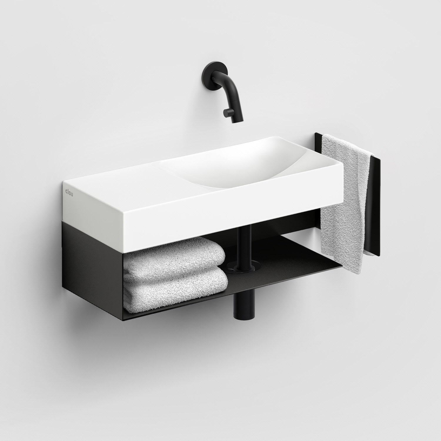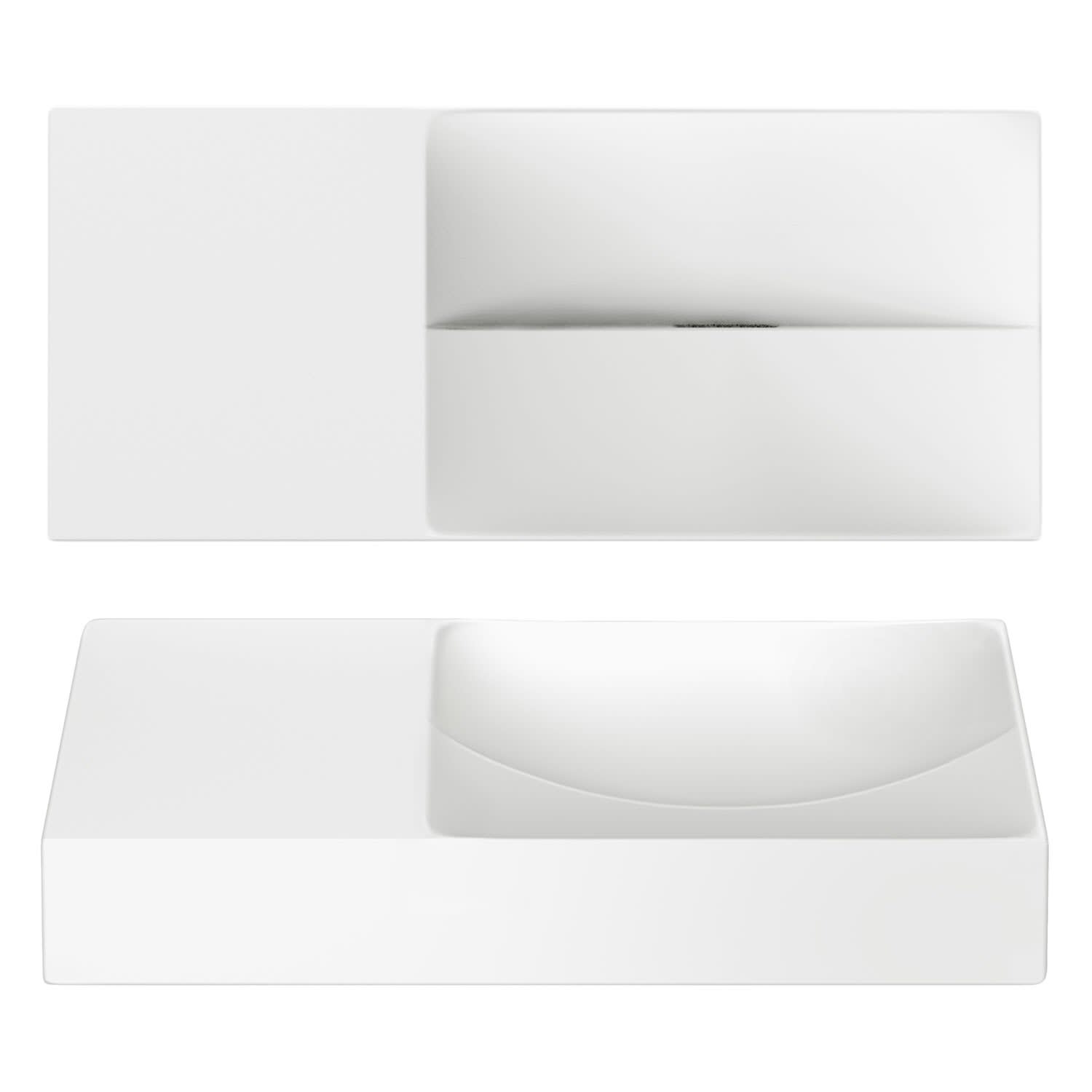 Zwei Ebenen, zwei Kurven mit unterschiedlichen Höhen. Ein einfallsreiches Design sorgt dafür, dass Wasser ordentlich abfließt. Keine Ablaufgarnitur erforderlich. An die Ablaufplatte am Boden des Handwaschbeckens kann jeder handelsübliche Siphon montiert werden.