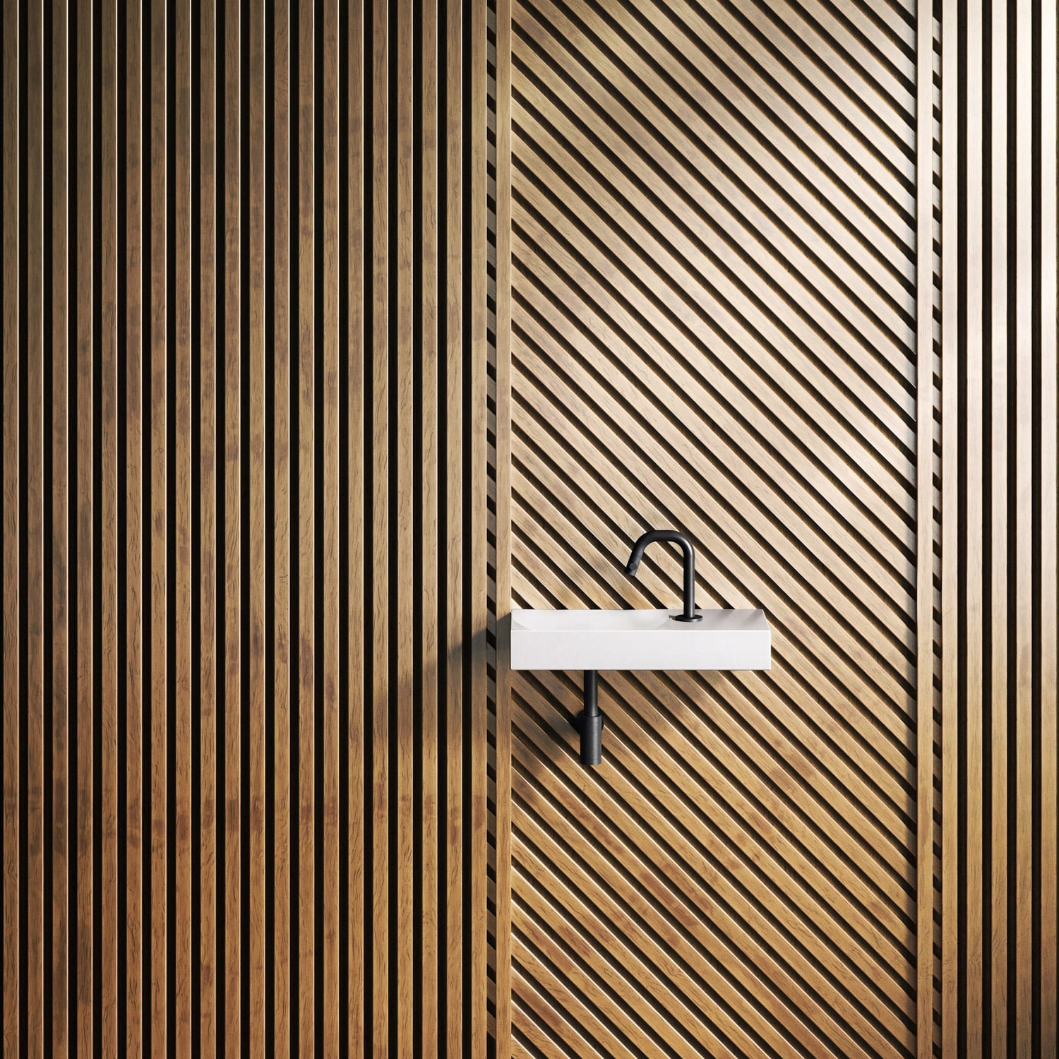 Zwei Ebenen, zwei Kurven mit unterschiedlichen Höhen. Ein einfallsreiches Design sorgt dafür, dass Wasser ordentlich abfließt. Keine Ablaufgarnitur erforderlich. An die Ablaufplatte am Boden des Handwaschbeckens kann jeder handelsübliche Siphon montiert werden.