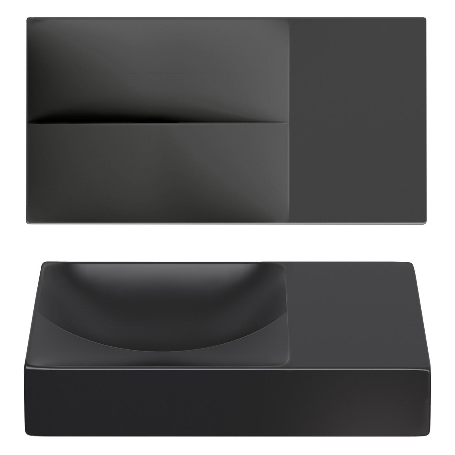 Zwei Ebenen, zwei Kurven mit unterschiedlichen Höhen. Ein einfallsreiches Design sorgt dafür, dass Wasser ordentlich abfließt. Keine Ablaufgarnitur erforderlich. An die Ablaufplatte am Boden des Handwaschbeckens kann jeder handelsübliche Siphon montiert werden.