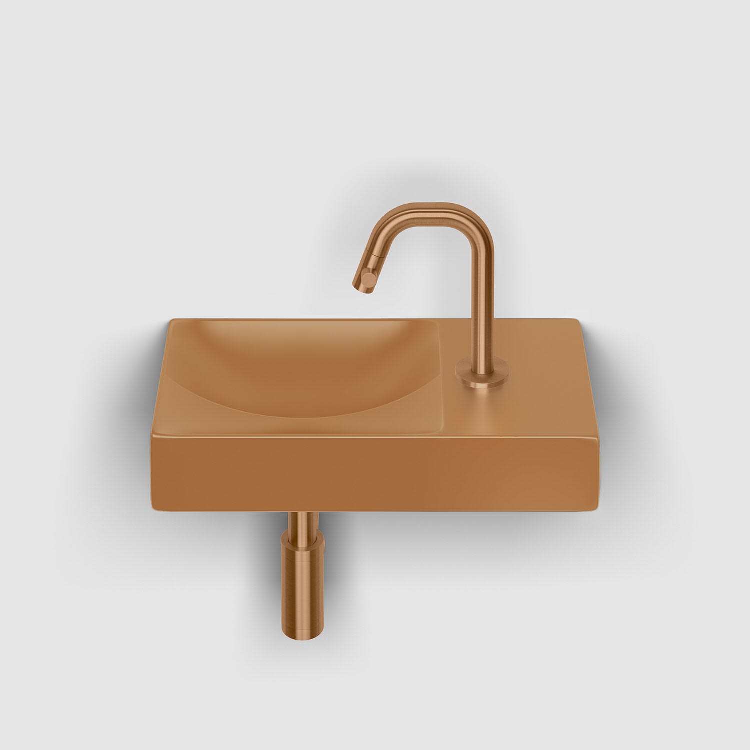 Zwei Ebenen, zwei Kurven mit unterschiedlichen Höhen. Ein einfallsreiches Design sorgt dafür, dass Wasser ordentlich abfließt. Keine Ablaufgarnitur erforderlich. An die Ablaufplatte am Boden des Handwaschbeckens kann jeder handelsübliche Siphon montiert werden.