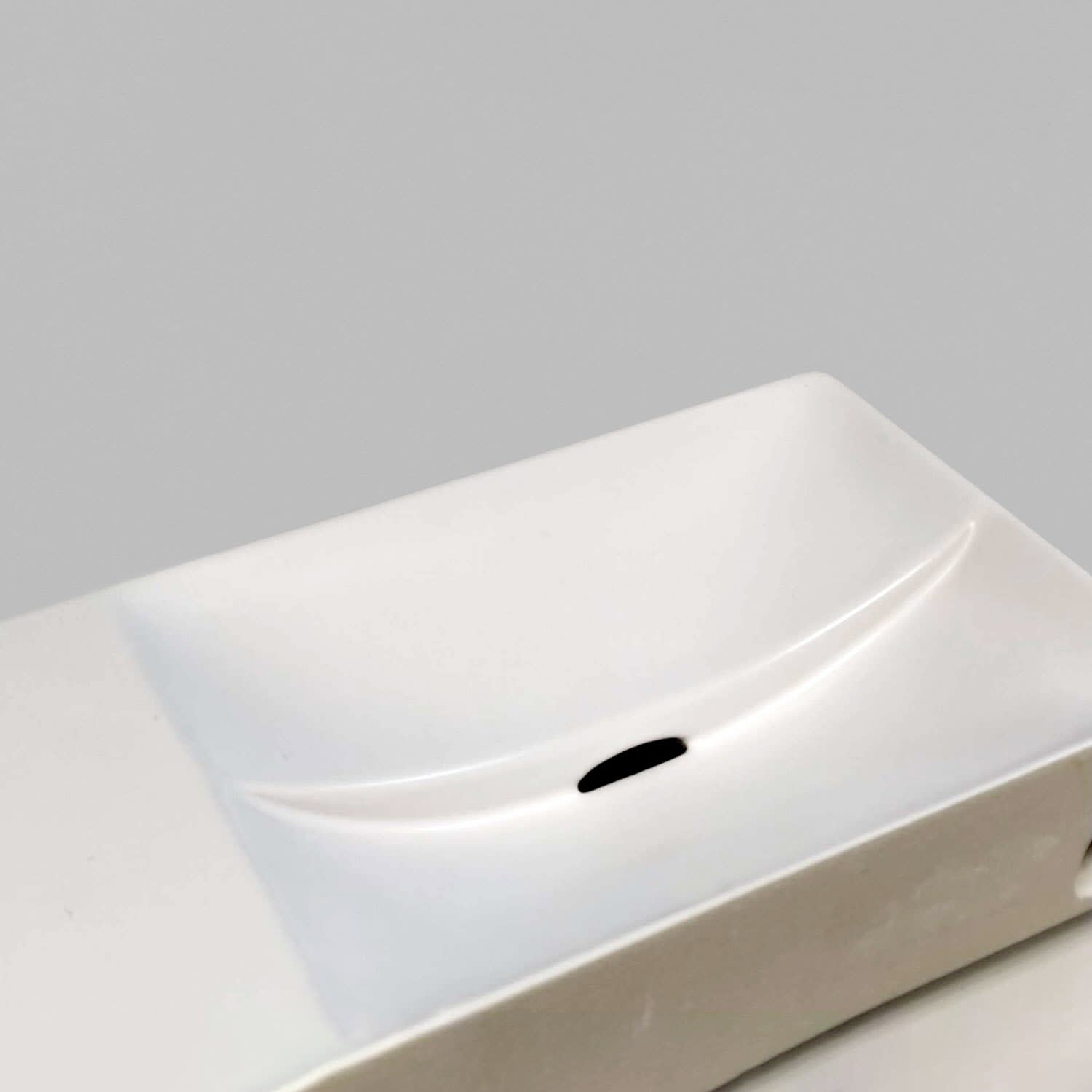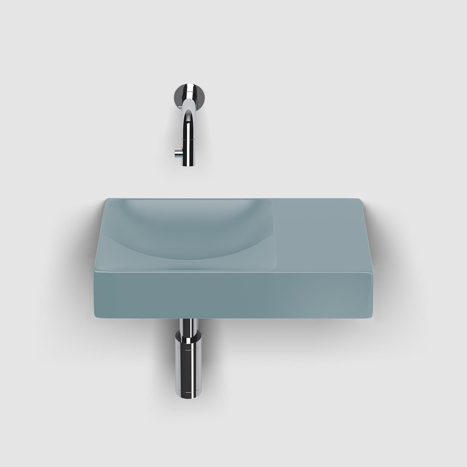 Zwei Ebenen, zwei Kurven mit unterschiedlichen Höhen. Ein einfallsreiches Design sorgt dafür, dass Wasser ordentlich abfließt. Keine Ablaufgarnitur erforderlich. An die Ablaufplatte am Boden des Handwaschbeckens kann jeder handelsübliche Siphon montiert werden.