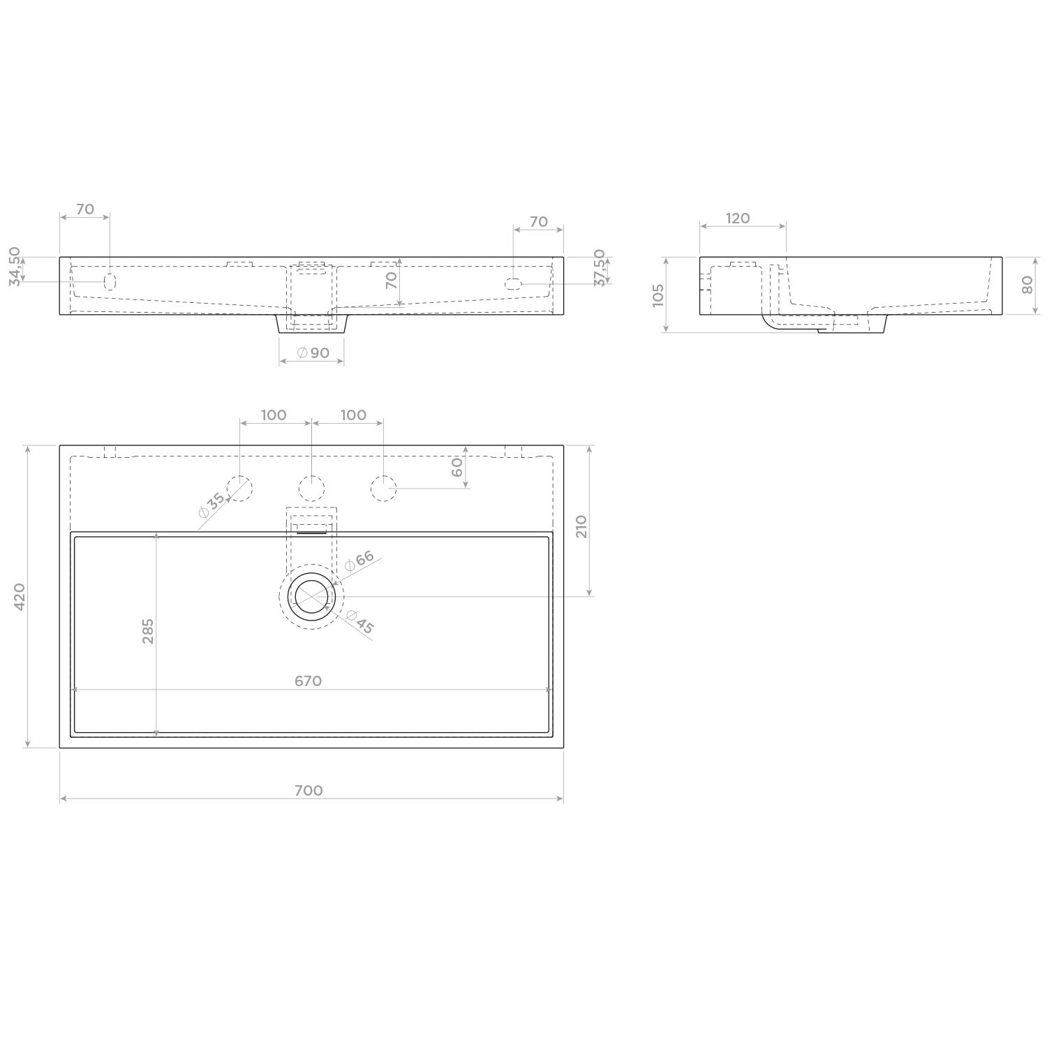 Clou Wash Me Aluite - Waschtisch 70 cm mit 3 vorgestochenen Hahnlöchern