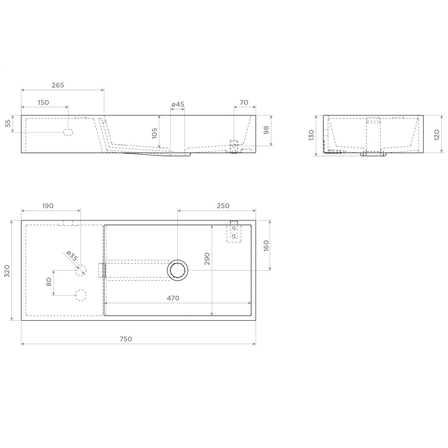 Clou Wash Me Aluite Waschtisch 75 cm ohne Hahnloch mit Ablage links