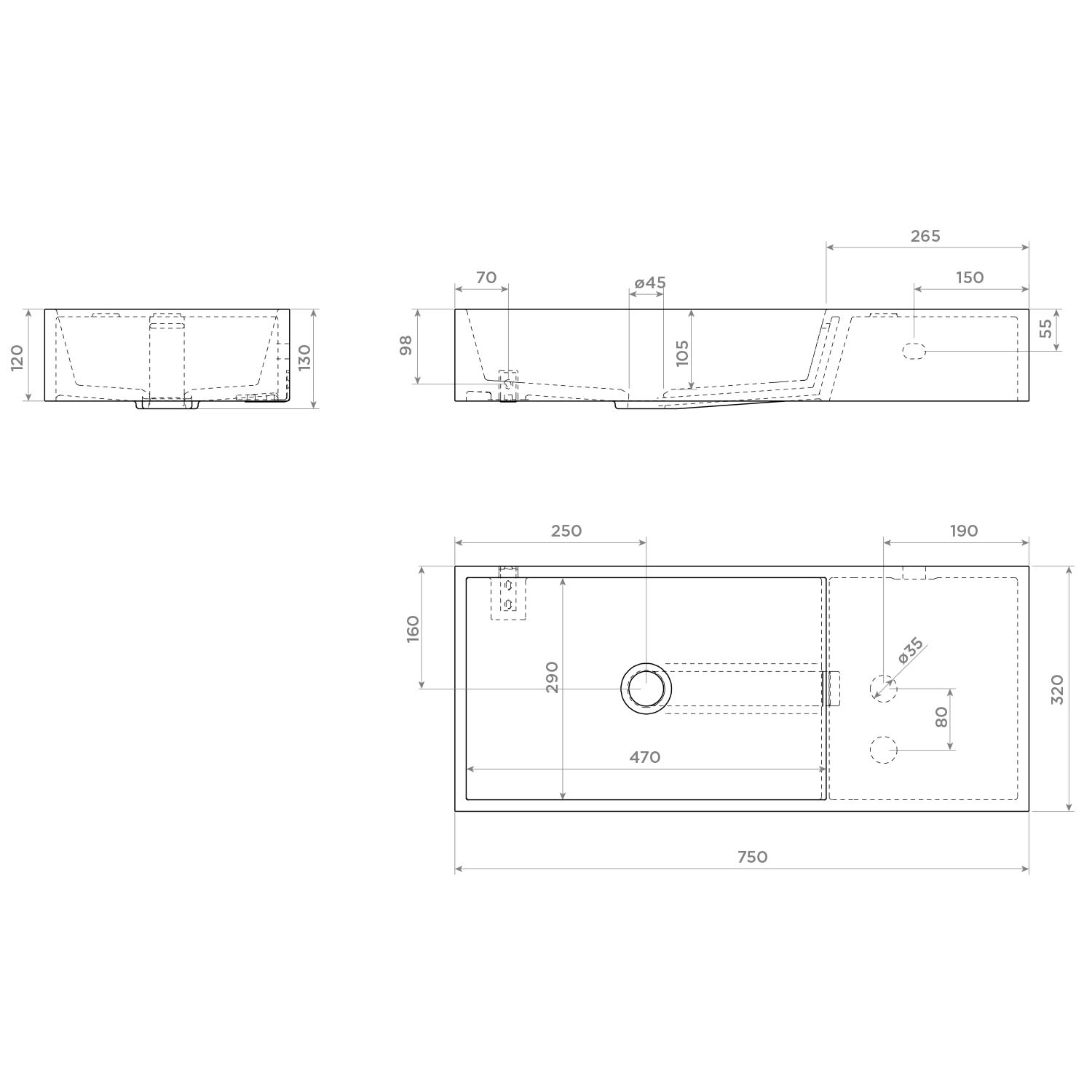 Clou Wash Me Aluite Waschtisch 75 cm ohne Hahnloch mit Ablage rechts