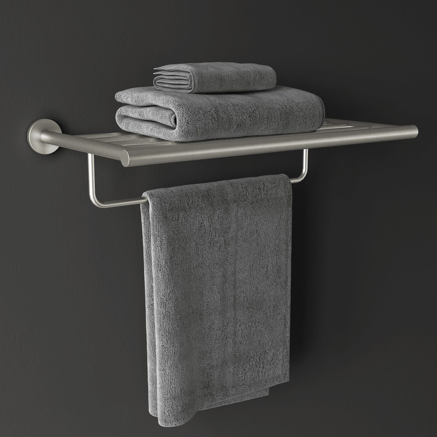 Eine gute Möglichkeit, um Stauraum für Ihre Handtücher zu schaffen, ist die Installation eines Handtuchhalters wie diesem. Es handelt sich um ein Zubehör, mit dem Sie mehrere Handtücher falten und ein weiteres nach dem Gebrauch zum Trocknen aufhängen können. Er ist in mattem Edelstahl ausgeführt. Darüber hinaus ist er nach der Installation vollständig an der Wand befestigt, da es über ein von Cosmic entwickeltes, extrem widerstandsfähiges Befestigungssystem verfügt, das die vollständige Befestigung garantiert. Dieser Handtuchhalter gehört zu der Kollektion Architect S+, die von Cosmic Studio mit dem Ziel entworfen wurde, eine Kollektion mit maximaler Funktionalität anzubieten. Cosmic ist eine Marke, die sich auf Designer-Bad-Accessoires und -Möbel spezialisiert hat. Sie zeichnet sich durch Innovation und die Verwendung neuer Materialien aus und ist bestrebt, das Wohlbefinden der Badbenutzer zu fördern. Dieser doppelte Handtuchhalter ist aus Messing oder einer ähnlichen Legierung hergestellt. Das Produkt hat eine Garantie von 10 Jahren. Zur Reinigung Seifenwasser verwenden, mit viel Wasser abspülen und anschließend mit einem weichen Tuch oder Fensterleder abtrocknen. Verwenden Sie niemals starke säurehaltige Produkte, Bleichmittel oder Scheuermittel.