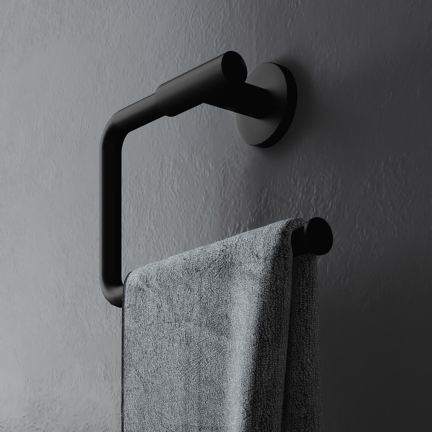 Handtuchring mit seitlicher Öffnung. Er ist mit einem weichen Schwarz versehen, einem extra matten Schwarz, das es sehr widerstandsfähig, kompakt und gleichmäßig macht. Darüber hinaus wird er nach der Installation vollständig an der Wand befestigt, da er ein äußerst widerstandsfähiges Befestigungssystem enthält, das von Cosmic entwickelt wurde, um seine vollständige Unterstützung zu gewährleisten. Dieser Handtuchring gehört zur Architect S+ -Kollektion, die von Cosmic Studio mit dem Ziel entwickelt wurde, eine Kollektion mit maximaler Funktionalität zu bieten. Cosmic ist eine Marke, die sich auf Designer-Badzubehör und -möbel spezialisiert hat und sich durch Innovation und die Anwendung neuer Materialien sowie durch die Suche nach dem Wohlbefinden des Badbenutzers auszeichnet. Der Handtuchring besteht aus Messing oder ähnlichen Legierungen in dreiwertiger Chromoberfläche. Produkt mit 10 Jahren Garantie. Verwenden Sie zur Reinigung Seifenwasser, spülen Sie es mit viel Wasser ab und trocknen Sie es schließlich mit einem weichen Tuch oder Fensterleder ab. Verwenden Sie niemals starke Produkte, die Säuren, Bleichmittel oder Schleifmittel enthalten.