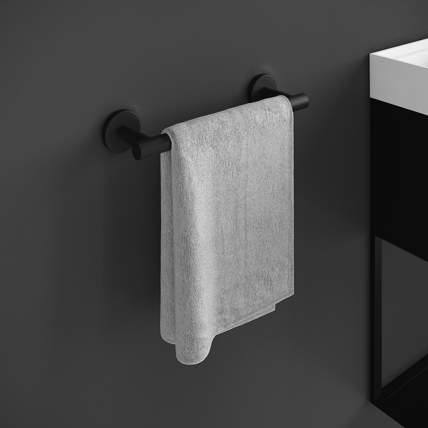 Ein sehr praktisches und funktionelles Accessoire, mit dem Sie Ihr Handtuch vor und nach dem Gebrauch aufhängen können. Sein Finish ist ein Soft Black, ein extra mattes Schwarz, das es sehr widerstandsfähig. kompakt und gleichmäßig macht. Darüber hinaus ist es nach der Installation vollständig an der Wand befestigt, da es über ein von Cosmic entwickeltes, extrem widerstandsfähiges Befestigungssystem verfügt, das die vollständige Befestigung garantiert. Dieser Handtuchhalter gehört zu der Kollektion Architect S+, die von Cosmic Studio mit dem Ziel entworfen wurde, eine Kollektion mit maximaler Funktionalität anzubieten. Cosmic ist eine Marke, die sich auf Designer-Bad-Accessoires und -Möbel spezialisiert hat. Sie zeichnet sich durch Innovation und die Verwendung neuer Materialien aus und ist bestrebt, das Wohlbefinden der Badbenutzer zu fördern. Dieser Handtuchhalter ist aus Messing oder ähnlichen Legierungen hergestellt. Das Produkt hat eine Garantie von 10 Jahren. Zur Reinigung Seifenwasser verwenden, mit viel Wasser abspülen und anschließend mit einem weichen Tuch oder Fensterleder abtrocknen. Verwenden Sie niemals starke säurehaltige Produkte, Bleichmittel oder Scheuermittel.