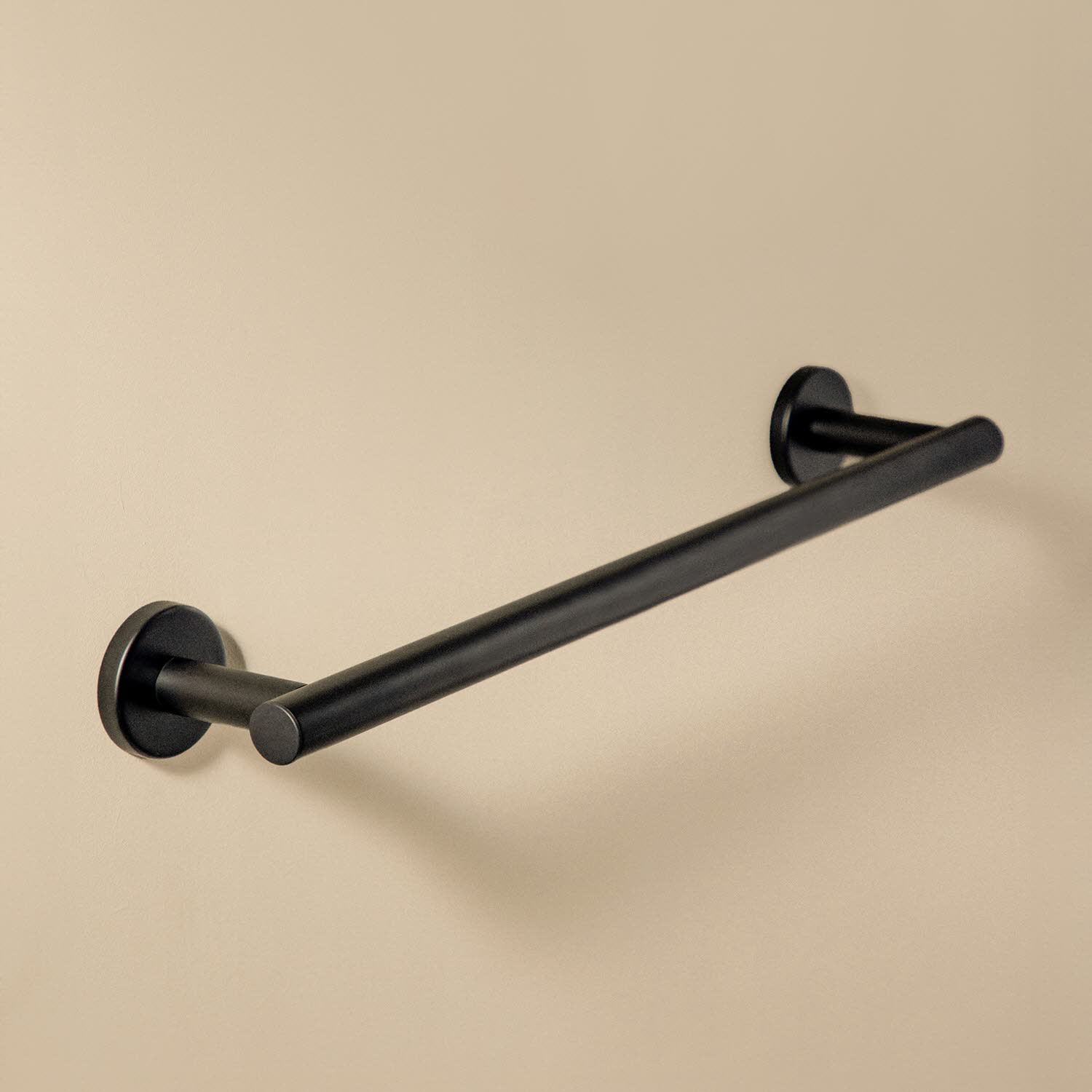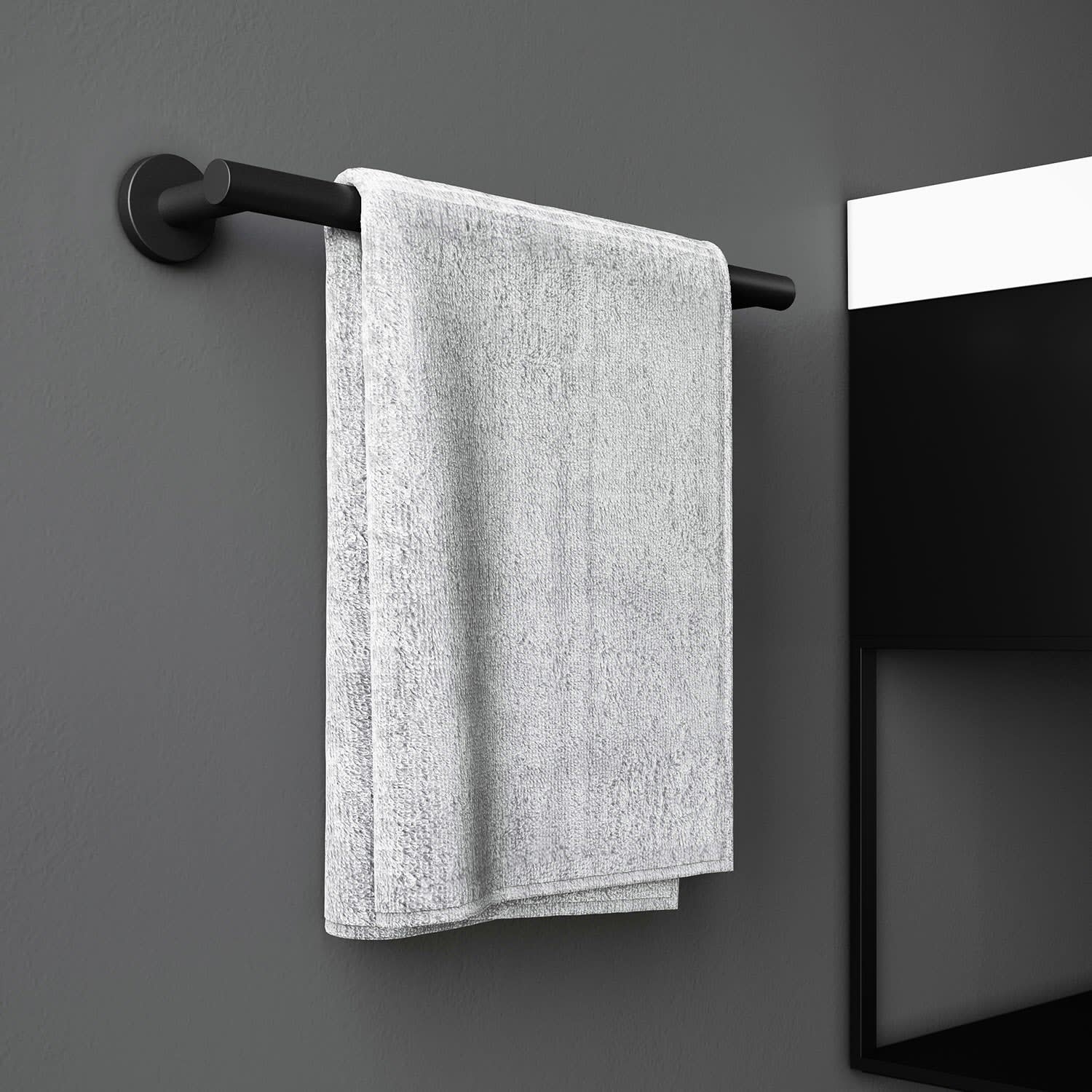Ein sehr praktisches und funktionelles Accessoire, mit dem Sie Ihr Handtuch vor und nach dem Gebrauch aufhängen können. Sein Finish ist ein Soft Black, ein extra mattes Schwarz, das es sehr widerstandsfähig. kompakt und gleichmäßig macht. Darüber hinaus ist es nach der Installation vollständig an der Wand befestigt, da es über ein von Cosmic entwickeltes, extrem widerstandsfähiges Befestigungssystem verfügt, das die vollständige Befestigung garantiert. Dieser Handtuchhalter gehört zu der Kollektion Architect S+, die von Cosmic Studio mit dem Ziel entworfen wurde, eine Kollektion mit maximaler Funktionalität anzubieten. Cosmic ist eine Marke, die sich auf Designer-Bad-Accessoires und -Möbel spezialisiert hat. Sie zeichnet sich durch Innovation und die Verwendung neuer Materialien aus und ist bestrebt, das Wohlbefinden der Badbenutzer zu fördern. Dieser Handtuchhalter ist aus Messing oder ähnlichen Legierungen hergestellt. Das Produkt hat eine Garantie von 10 Jahren. Zur Reinigung Seifenwasser verwenden, mit viel Wasser abspülen und anschließend mit einem weichen Tuch oder Fensterleder abtrocknen. Verwenden Sie niemals starke säurehaltige Produkte, Bleichmittel oder Scheuermittel.