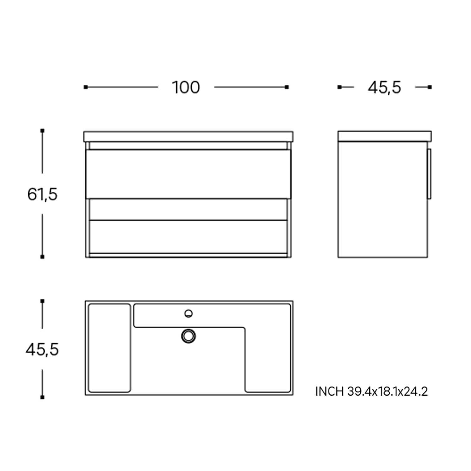 - B: 100 cm T: 45 cm H: 56,5 cm