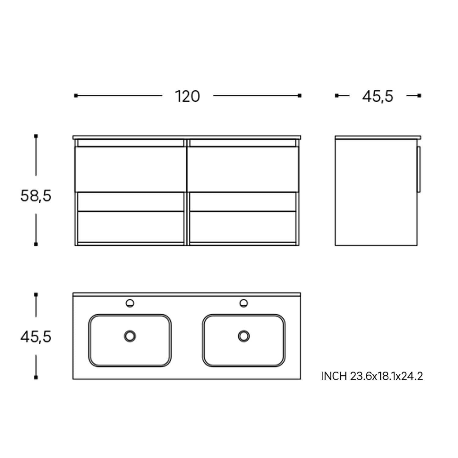 - B: 120 cm T: 45 cm H: 56,5 cm