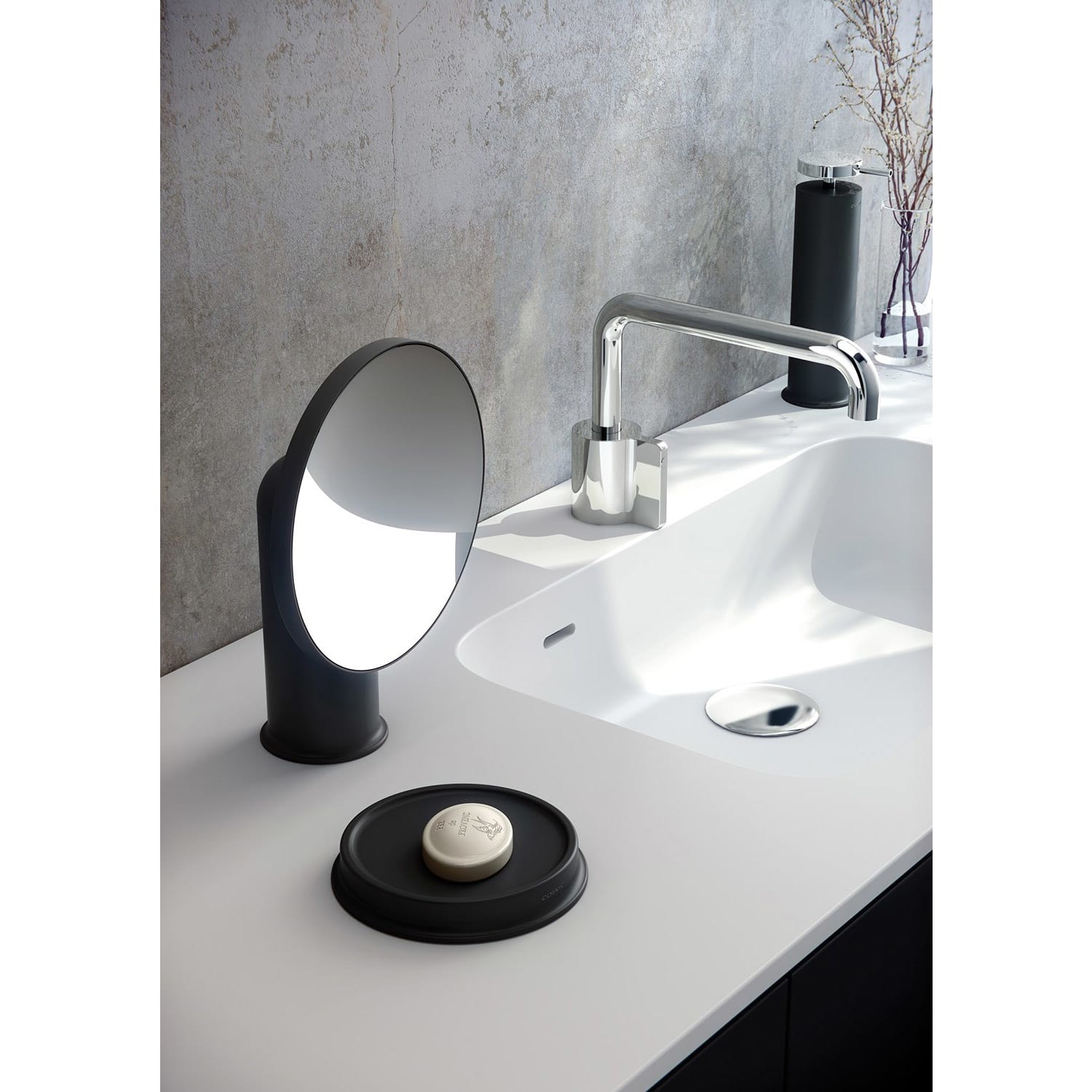 Dieser Vergrößerungsspiegel ist Teil der Geyser-Kollektion von Cosmic. Der von Nahtrang entworfene Vorschlag ist eine Sammlung von Arbeitsplatten- und Bodenzubehör und ergänzt ein Design, das von Formen inspiriert ist, die wie Wasser fließen. Cosmic ist eine Marke, die sich auf Accessoires und Möbel für das Badezimmer spezialisiert hat und nach Innovationen sowohl bei Materialien als auch bei Designs sucht.