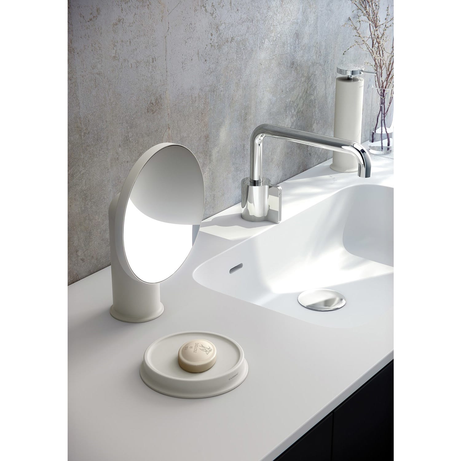 Diese Seifenschale ist Teil der Geyser-Kollektion von Cosmic. Der von Nahtrang entworfene Vorschlag ist eine Sammlung von Arbeitsplatten- und Bodenzubehör und ergänzt ein Design, das von Formen inspiriert ist, die wie Wasser fließen. Cosmic ist eine Marke, die sich auf Accessoires und Möbel für das Badezimmer spezialisiert hat und nach Innovationen sowohl bei Materialien als auch bei Designs sucht.