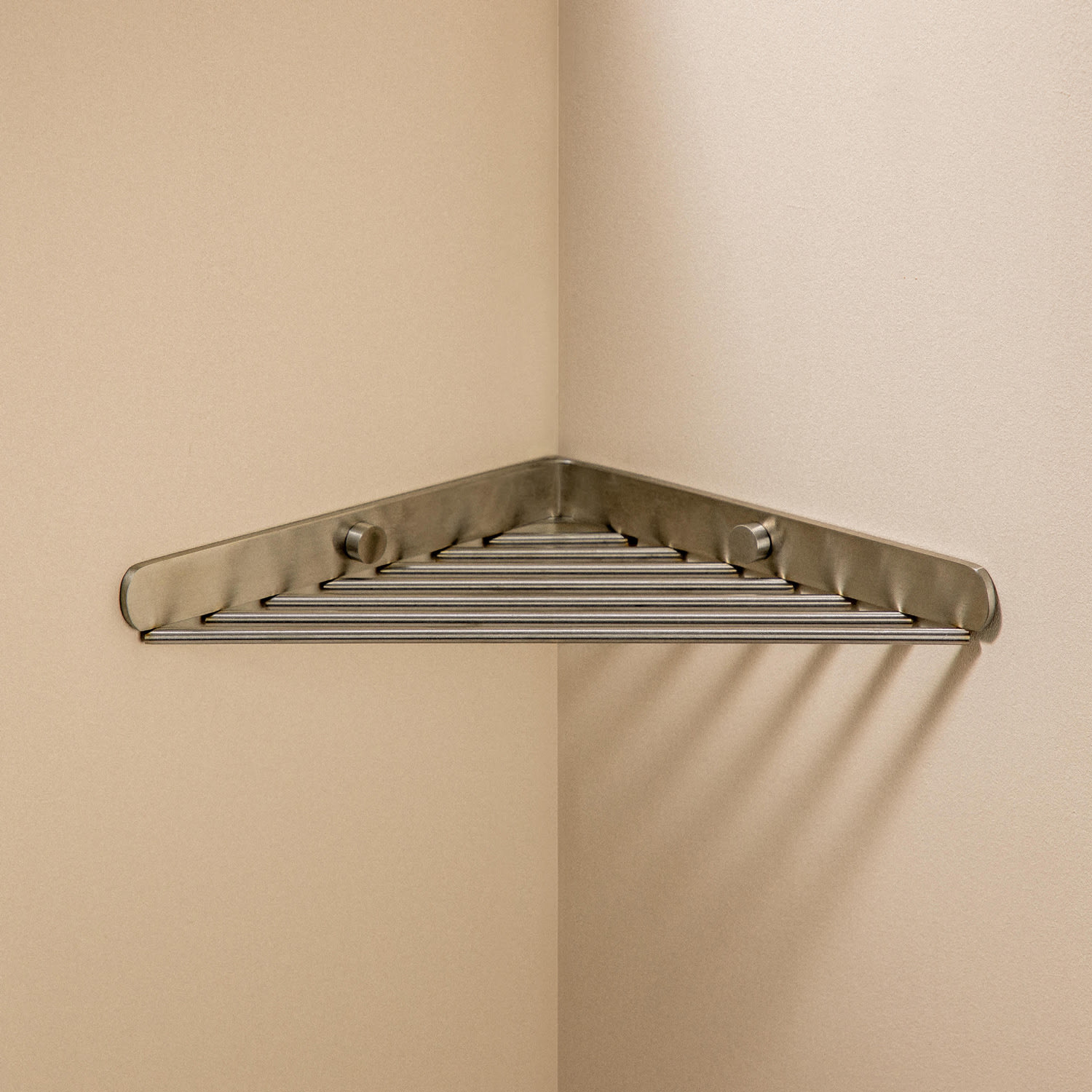 Mesh-Duschecke zur Installation in einer Ecke der Wand. So haben Sie alles, was Sie für die Dusche benötigen, zur Hand, ohne viel Platz in Anspruch zu nehmen. Mattes Edelstahlzubehör, auch in mattschwarzer Ausführung erhältlich.