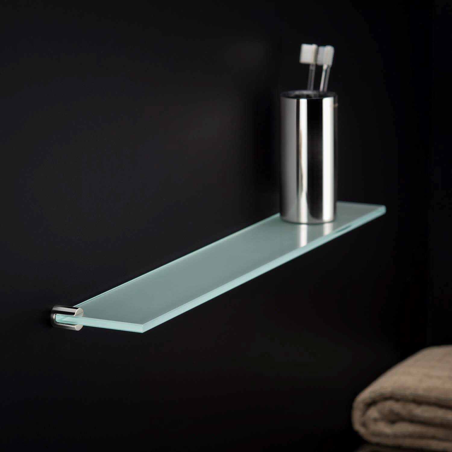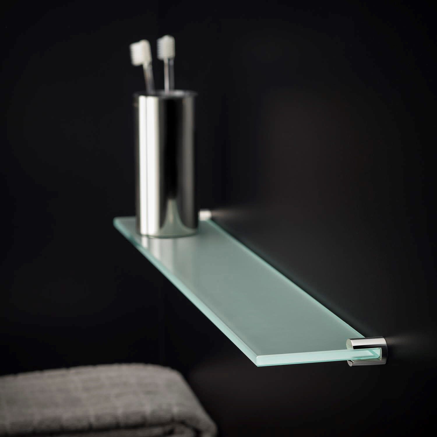 Badezimmerregal aus Glas, das auf praktische und funktionale Weise mehr Stauraum im Badezimmer bietet. Hochglänzende Messinghalterungen verleihen ihm einen Design-Touch. Wenn Sie den Stauraum erweitern müssen, können Sie dies mit einem Regal der anderen Größe mit derselben Oberfläche kombinieren.Die Halterungen sind auch aus mattem Edelstahl und mattschwarzem Finish erhältlich.