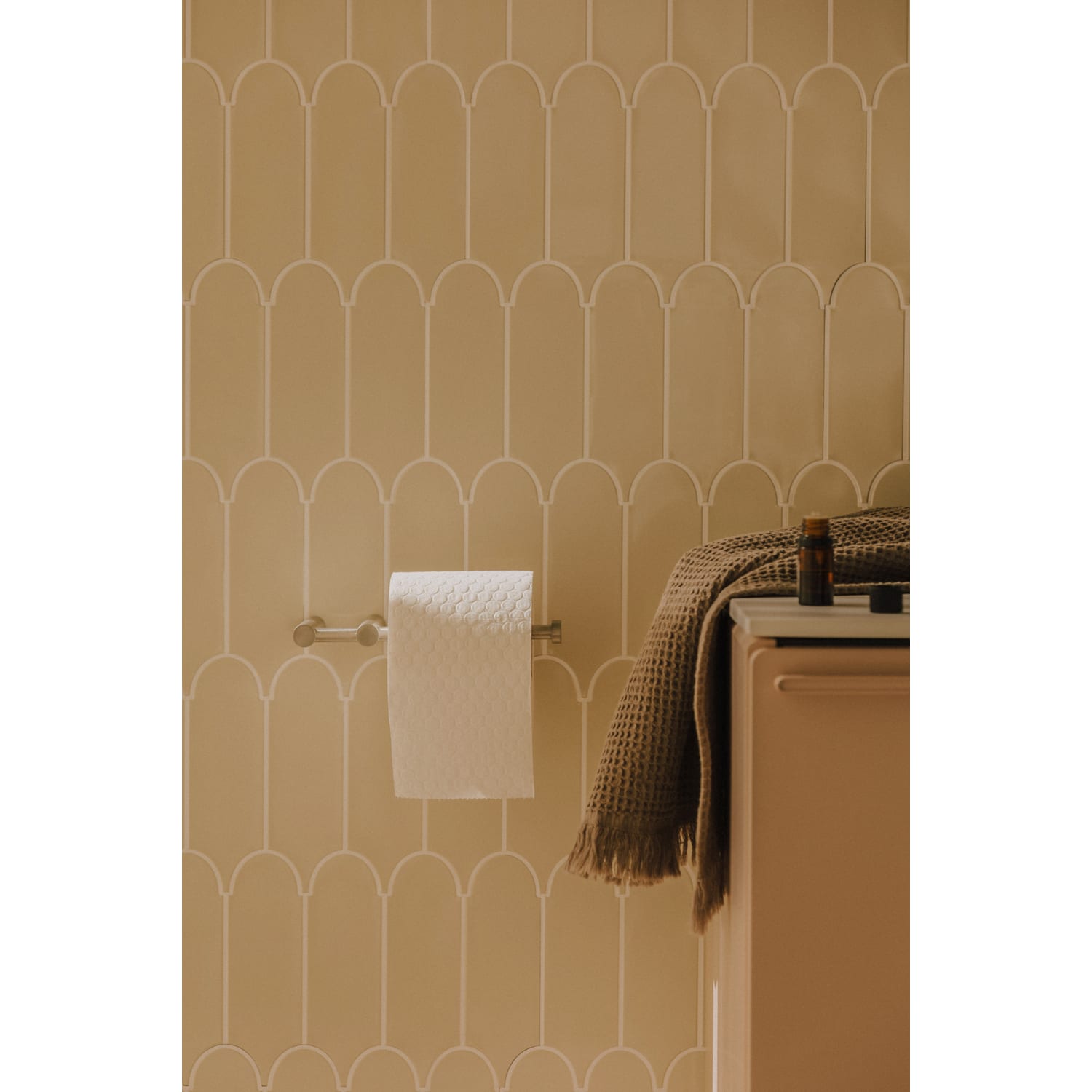 Papierhalter ohne Abdeckung zur Installation an der Wand, in einem glänzenden rostfreien Finish, als feste Stange dargestellt. Seine Form erleichtert den Austausch von Toilettenpapier. Möglich auch in mattem Edelstahl und mattem Schwarz. Wenn Sie es vorziehen, die Toilettenpapierrolle versteckt zu haben, bietet Ihnen dieselbe Serie zwei Modelle von Papierhaltern mit Abdeckungen.