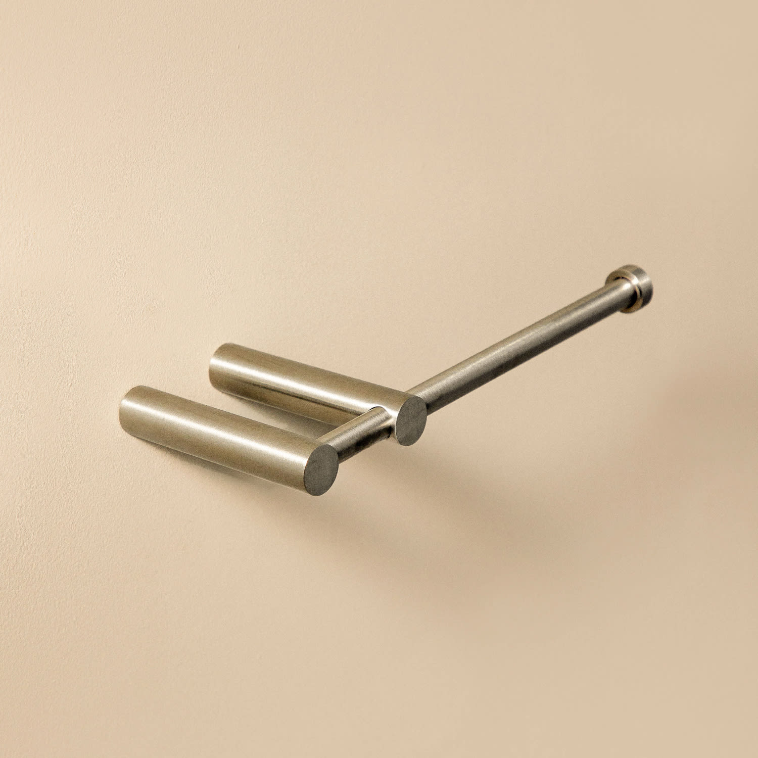 Papierhalter ohne Abdeckung zur Installation an der Wand, in mattem Edelstahl, als feste Stange dargestellt. Seine Form erleichtert den Austausch von Toilettenpapier. Möglich auch in glänzendem Edelstahl und mattem Schwarz. Wenn Sie es vorziehen, die Toilettenpapierrolle versteckt zu haben, bietet Ihnen dieselbe Serie zwei Modelle von Papierhaltern mit Abdeckungen.