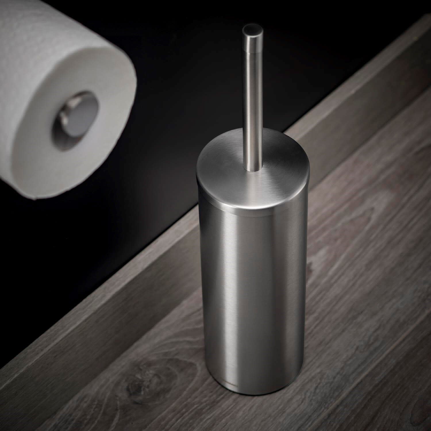 Moderner ästhetischer Toilettenbürstenhalter, der auf den Boden gestellt werden kann. Es ist keine Installation erforderlich. Das Edelstahl-Zubehör ist in mattem Edelstahl-Finish, aber auch in glänzendem Edelstahl und mattem Schwarz erhältlich. Wenn Sie möchten, steht Ihnen auch die Version zur Verfügung, die Sie an der Wand befestigen können.