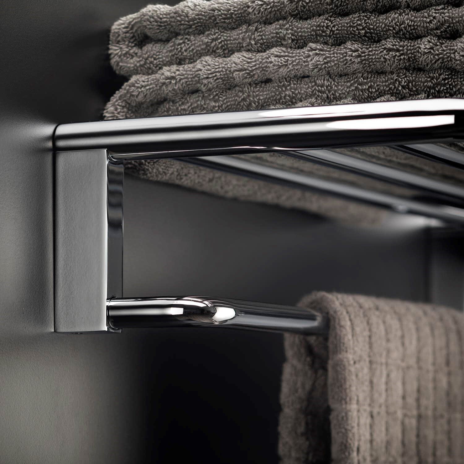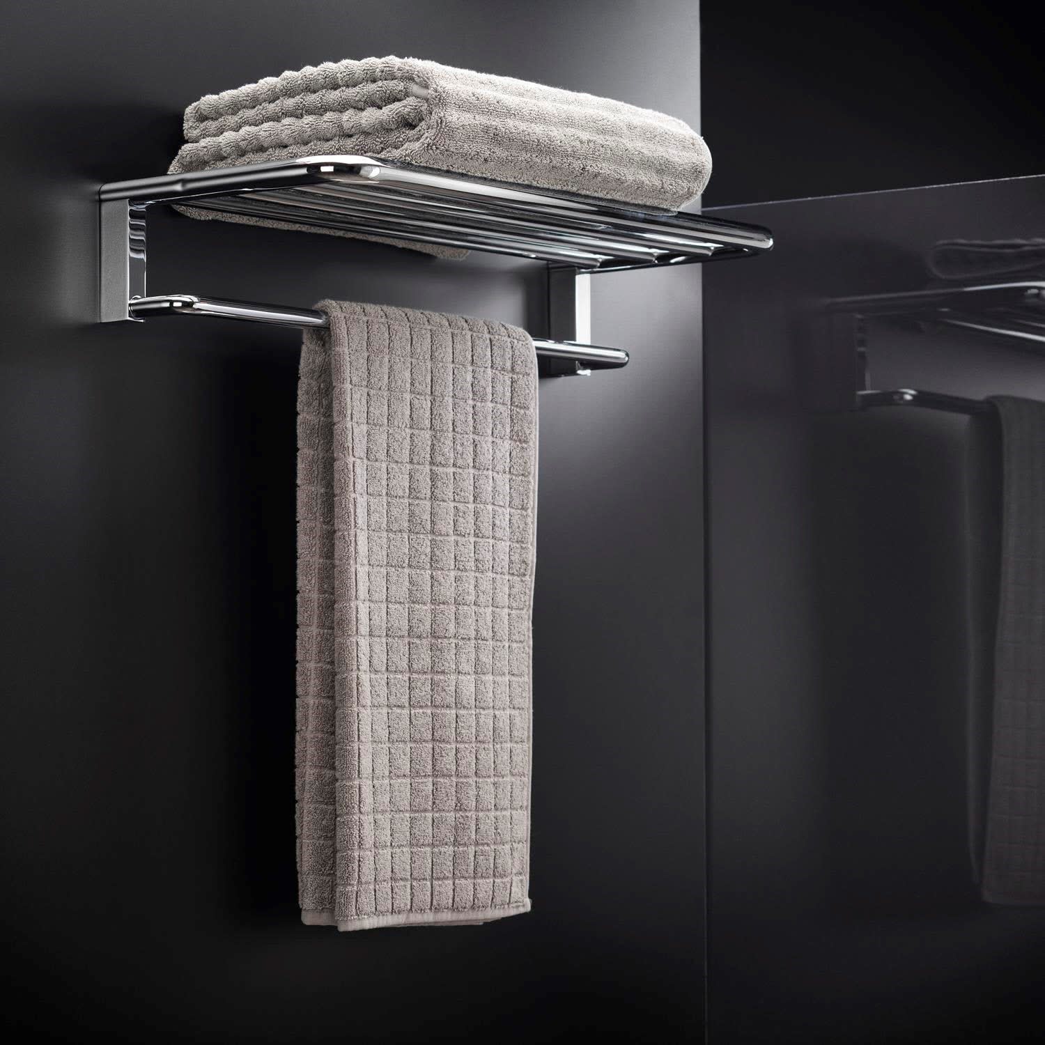 Handtuchhalter zur Installation an der Wand Ihres Badezimmers in Chromoptik. Ein sehr praktisches Accessoire, mit dem Sie zusätzlichen Platz für Ihre Handtücher haben. Darüber hinaus ist das Design so konzipiert, dass Sie das Badetuch nach Gebrauch aufhängen und das Trocknen erleichtern können. Der Rest der Handtücher kann perfekt gefaltet werden, was es zu einem funktionalen und dekorativen Element macht.