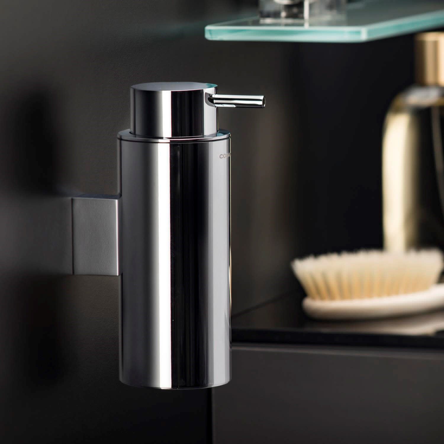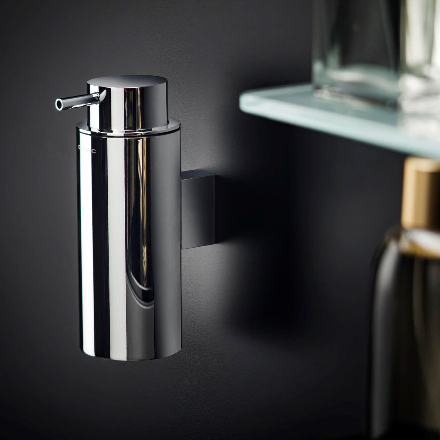 Dieser Spender ist Teil der Cosmic Project-Kollektion. Entworfen von Cosmic Studio, ist es eine komplette Sammlung von 30 Accessoires für das Badezimmer, die verschiedene Formen und Materialien kombinieren. Mit Project vervollständigen Sie Ihr Badezimmer mit einem Vorschlag voller Persönlichkeit.