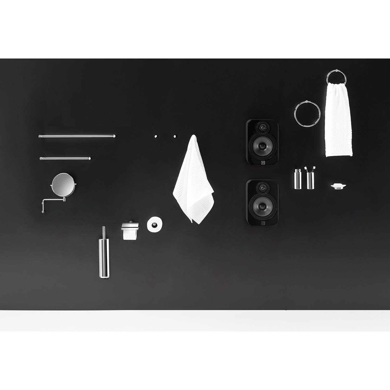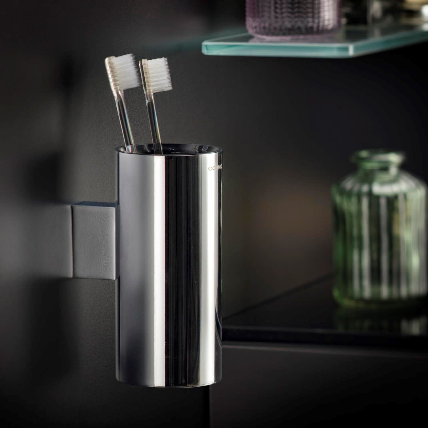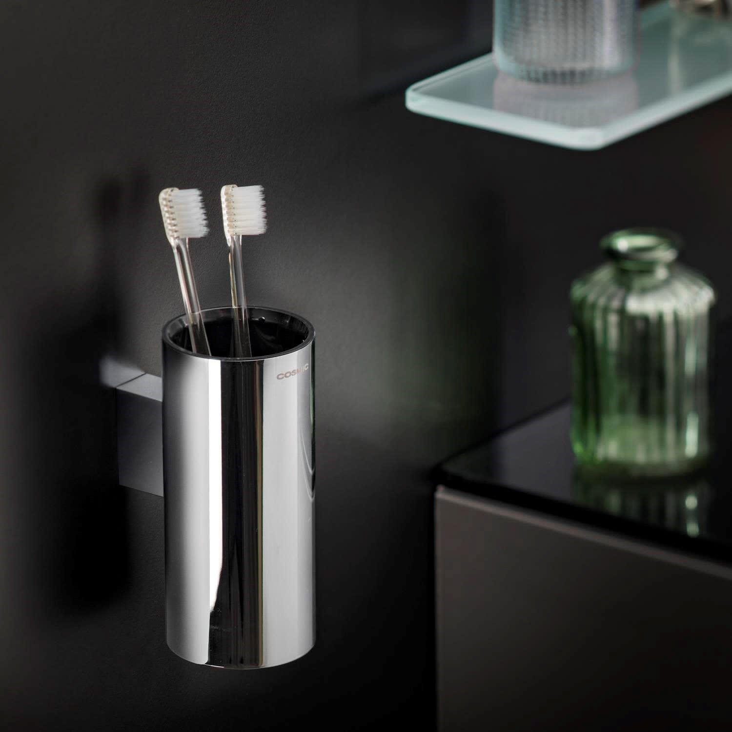 Zahnbürstenhalter zur Montage an der Wand. Zum Organisieren Ihrer Zahnbürsten oder Make-up-Bürsten, Make-up-Stiften oder Pinseln. Mit einem Chrom-Finish und einem abnehmbaren schwarzen Kunststoff-Innenglas ist es eine ideale Kombination, die Ihrem Badezimmer einen Hauch von Design verleiht. Die Version, die auf der Arbeitsplatte platziert werden kann, ist ebenfalls erhältlich.