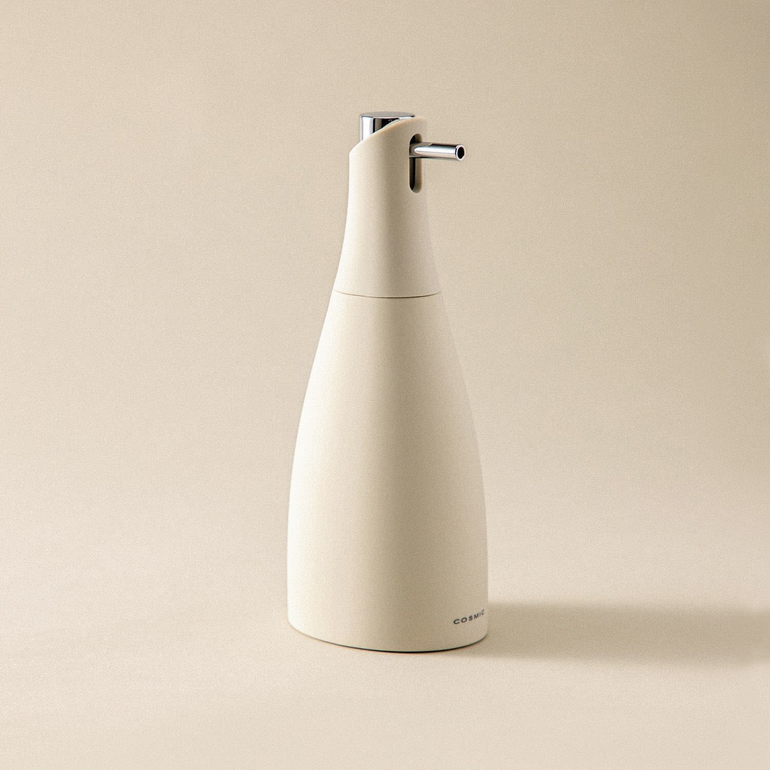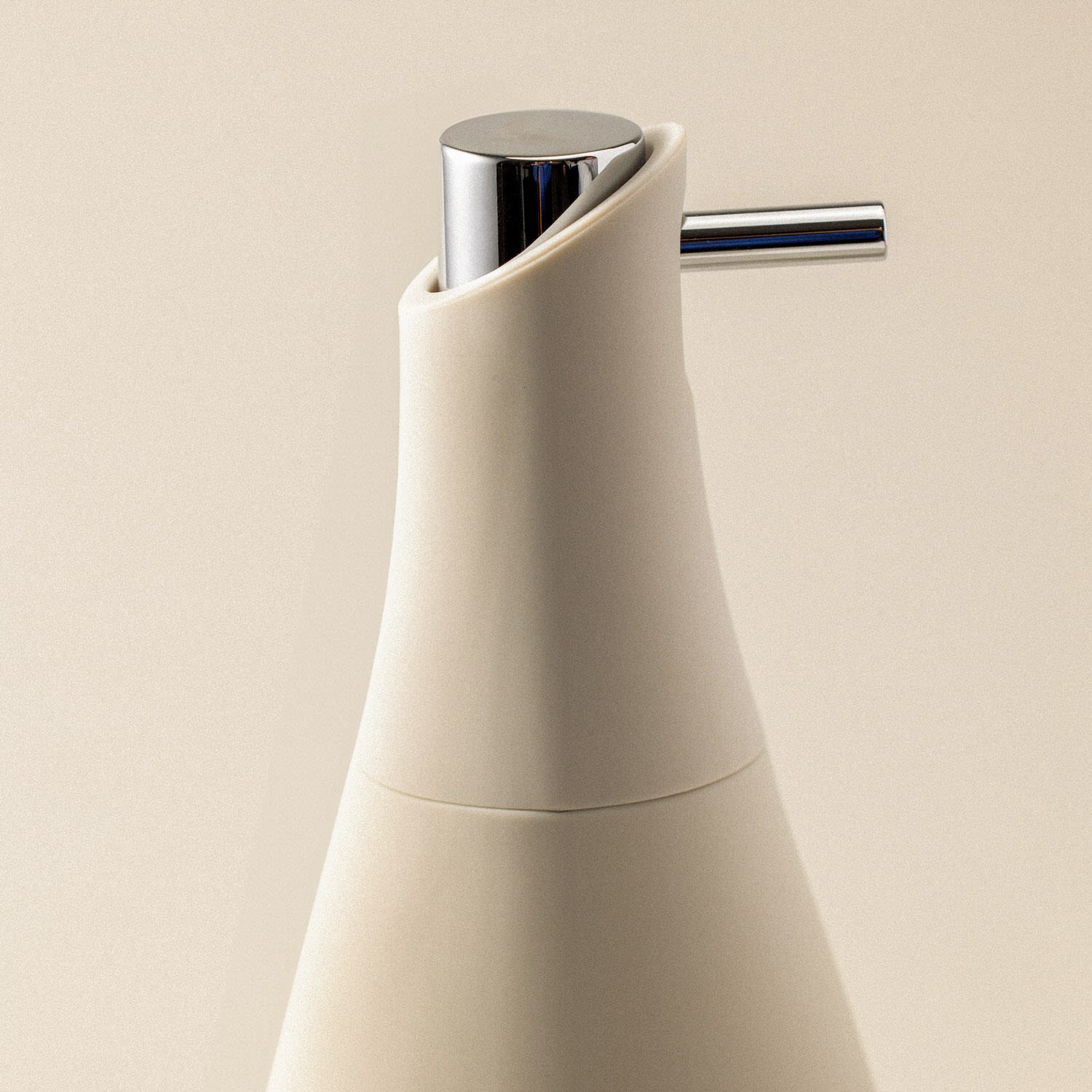 Spender mit glatten Linien auf der Arbeitsplatte Ihres Badezimmers und flüssiger Seife zur Hand. Ein Designstück, inspiriert von den organischen Formen der Natur und mit einem ausgeprägten orientalischen Einfluss. Es ist in weicher Steinfarbe gehalten und in fünf weiteren Ausführungen erhältlich.
