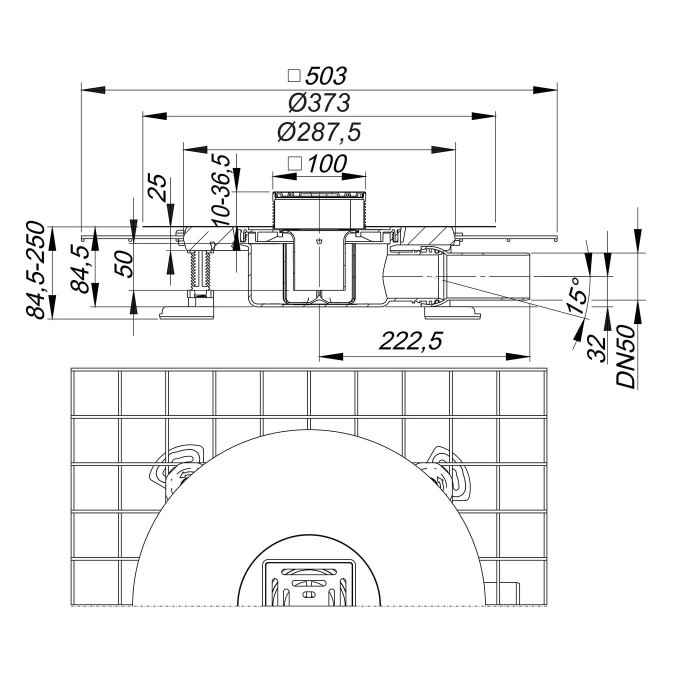 - Ablaufstutzen aus Polypropylen, DN 50 seitlich, mit Kugelgelenk 0-15 Grad verstellbar zum spannungsfreien Anschluss der Abwasserleitung