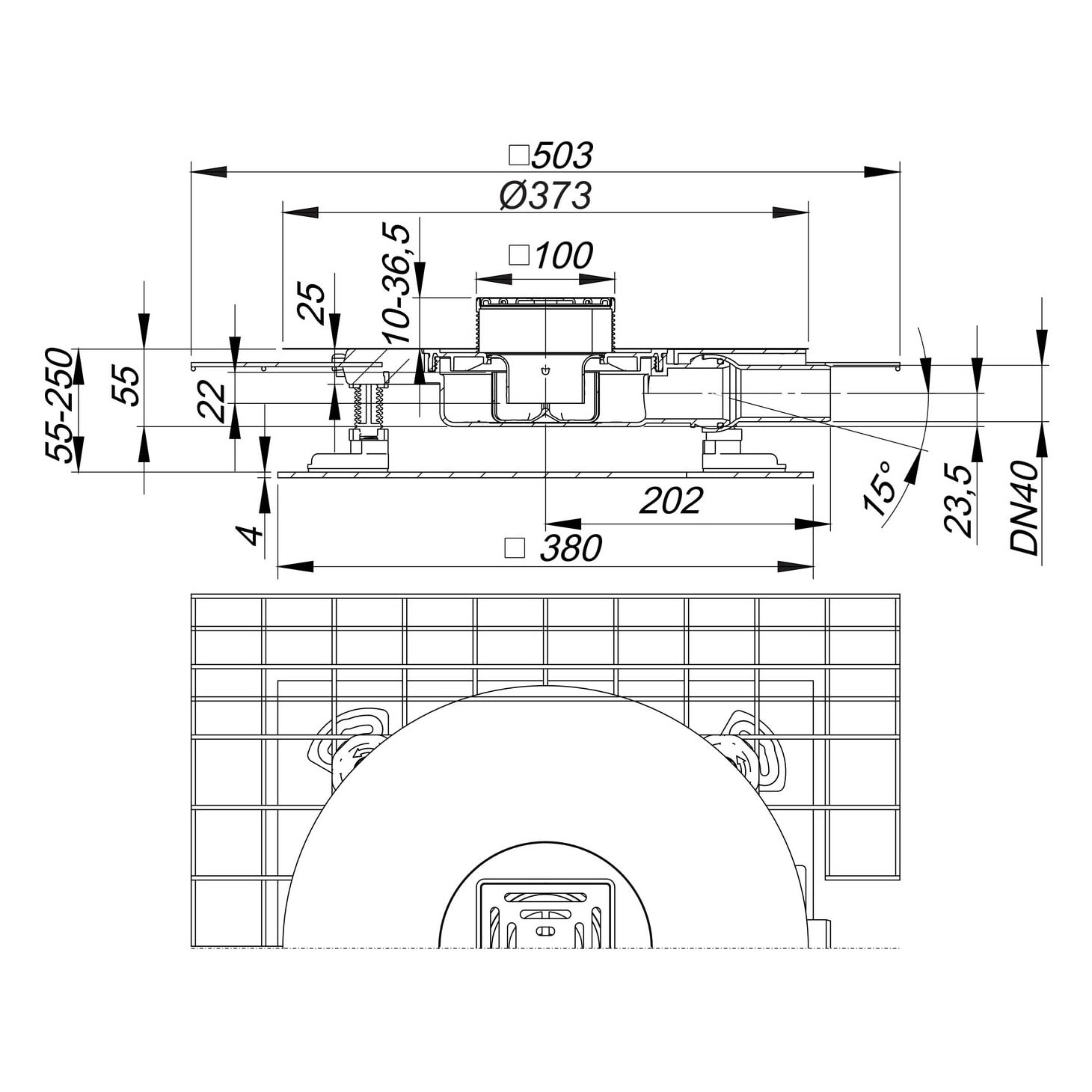 - Bodenablauf nach DIN EN 1253 inklusive Schallschutzmatte DallDrain, Aufsatz DallDrain Select mit Edelstahlrost im Edelstahlrahmen