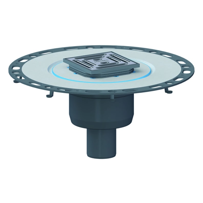 - Flansch für hohen Haftverbund zu Abdichtungsstoffen auf der Oberseite vlieskaschiert, auf der Unterseite mit Estrichankern zur sicheren, dauerhaften Fixierung im Estrich