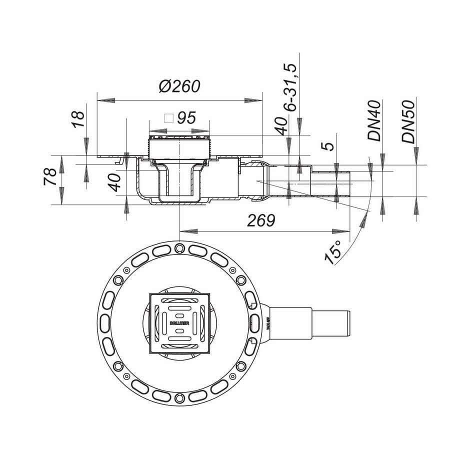 - Ablaufstutzen DN 40/DN 50 seitlich, mit Kugelgelenk, verstellbar von 0 – 15 Grad