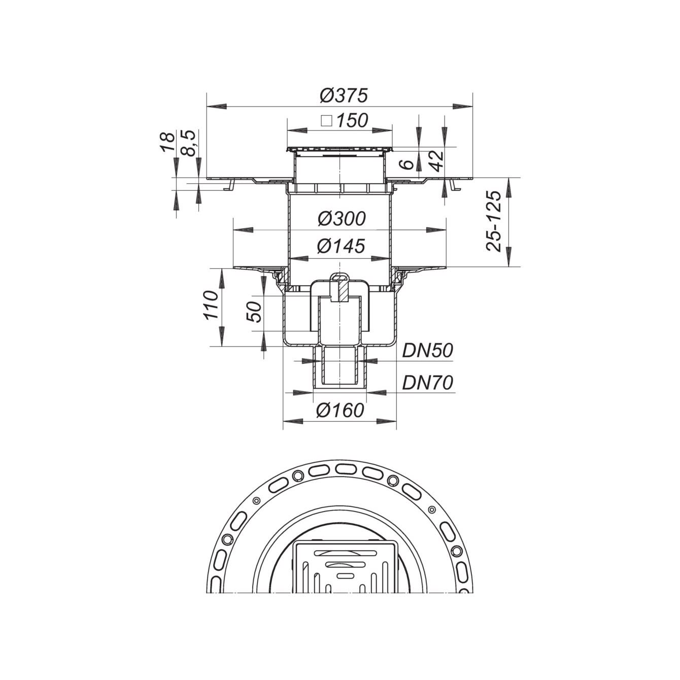 Dallmer Dünnbett-Bodenablauf 61 HT/VC, DN 50/DN 70, 15 x 15 cm