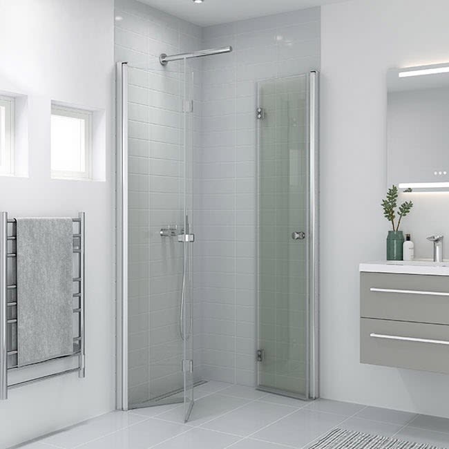 Wird sie mit einem zusätzlich erhältlichen 45° Wandanschlussprofil montiert eignet sich die Falttür auch für schräge Nischen.