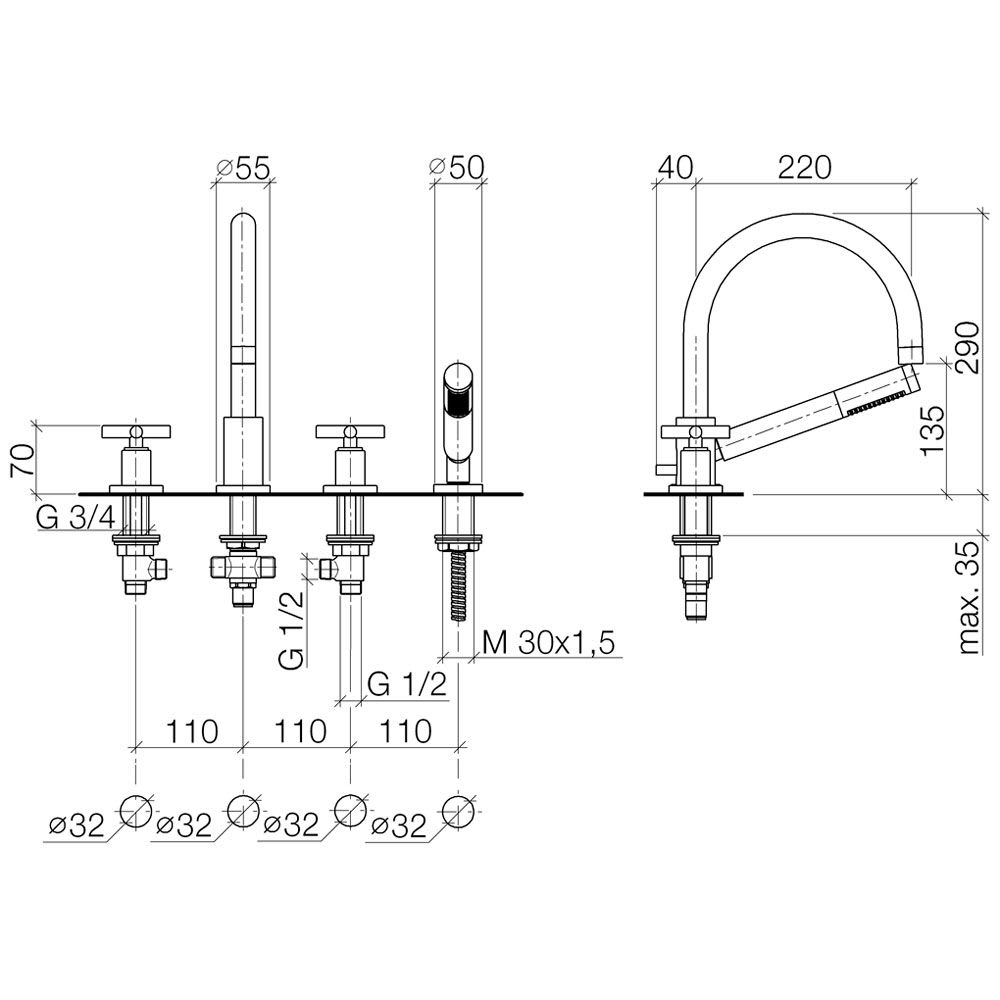 Dornbracht TARA Wannen-Vierlochbatterie für Wannenrand-/ Fliesenrandmontage