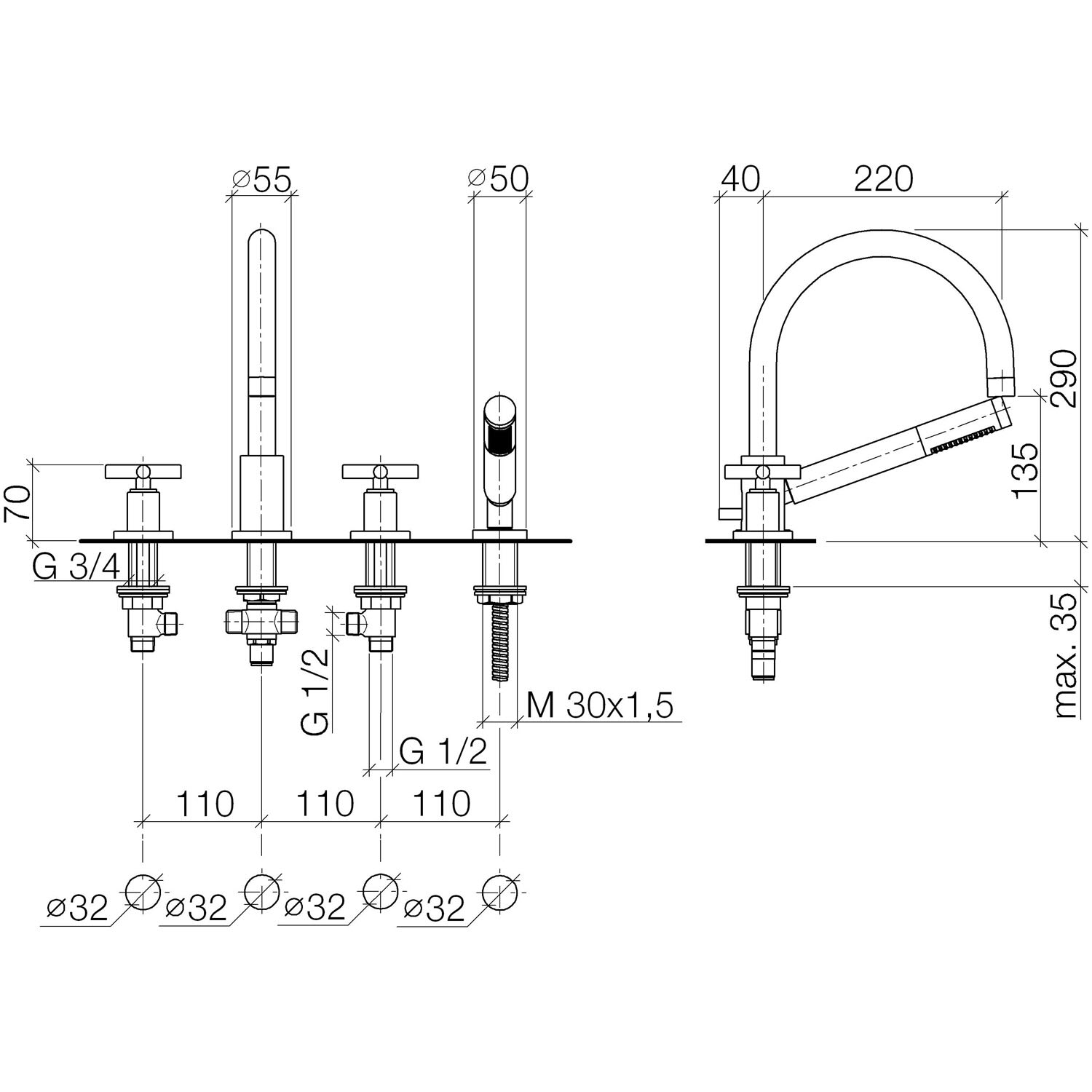 Dornbracht TARA Wannen-Vierlochbatterie für Wannenrand-/ Fliesenrandmontage