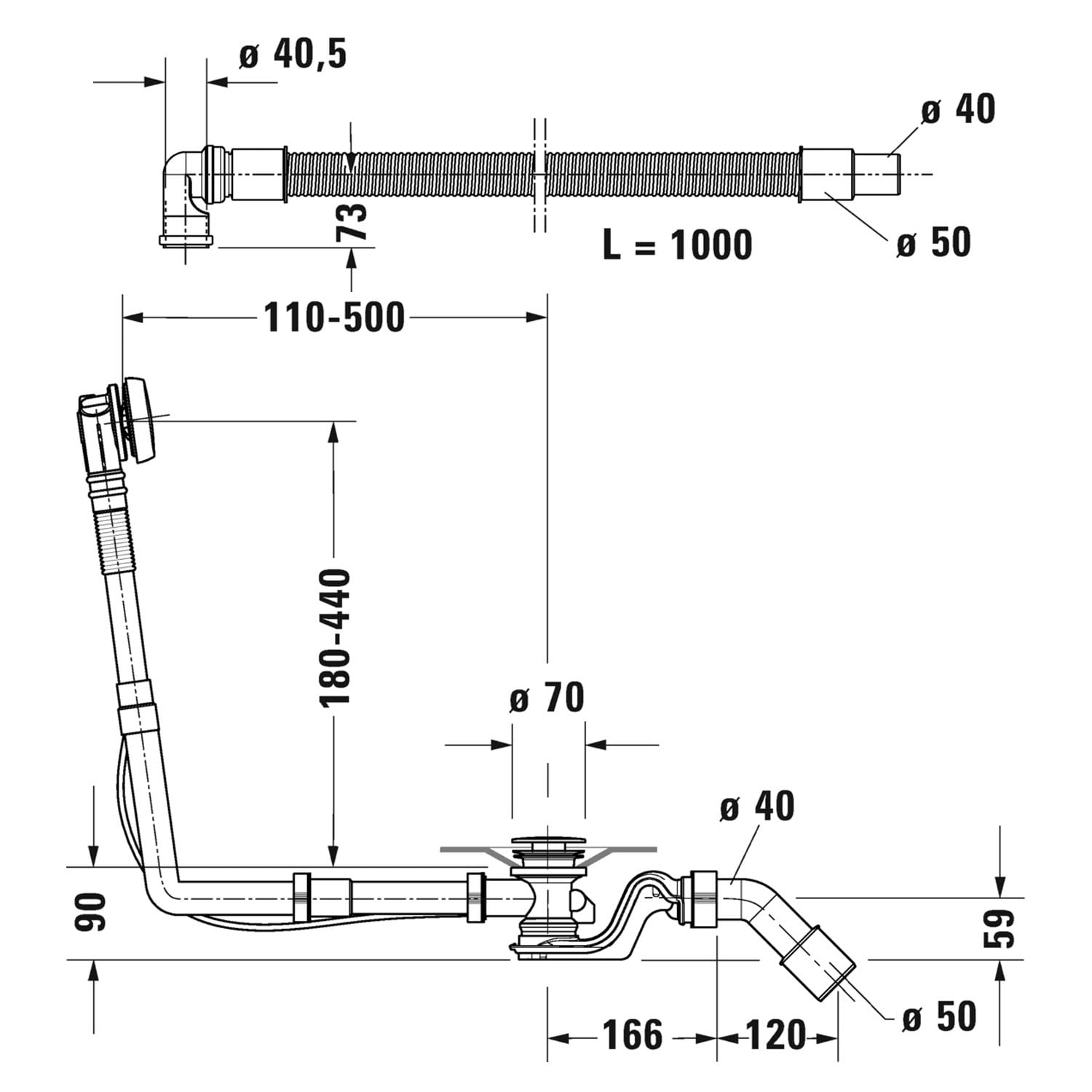 Duravit Ab- und Überlaufgarnitur Quadroval, Bowdenzug 65 cm